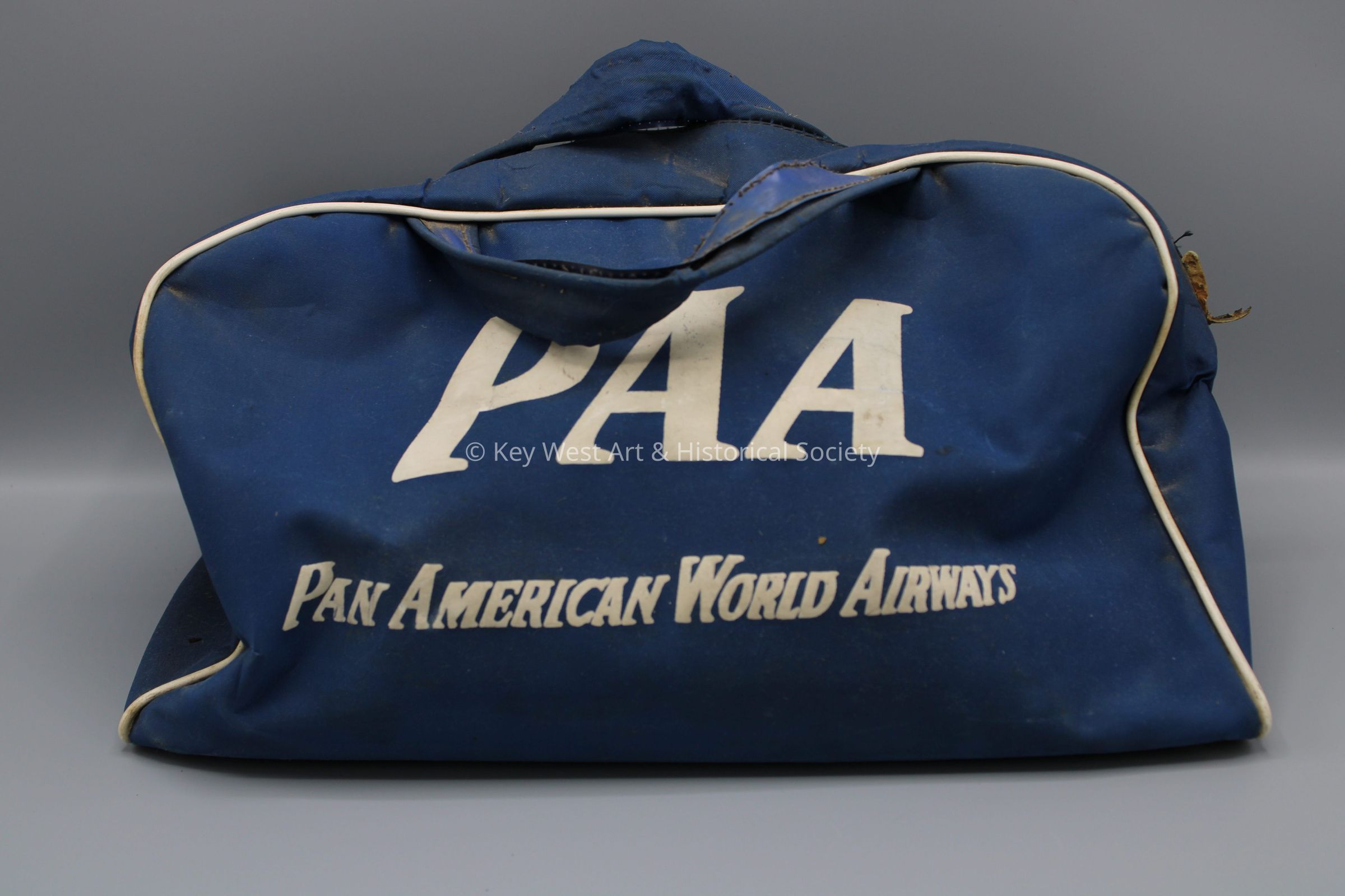 Blue vinyl Pan Am World Airways travel bag. Zippered closure with two short straps and four small metal feet on the base of the tote.Collection