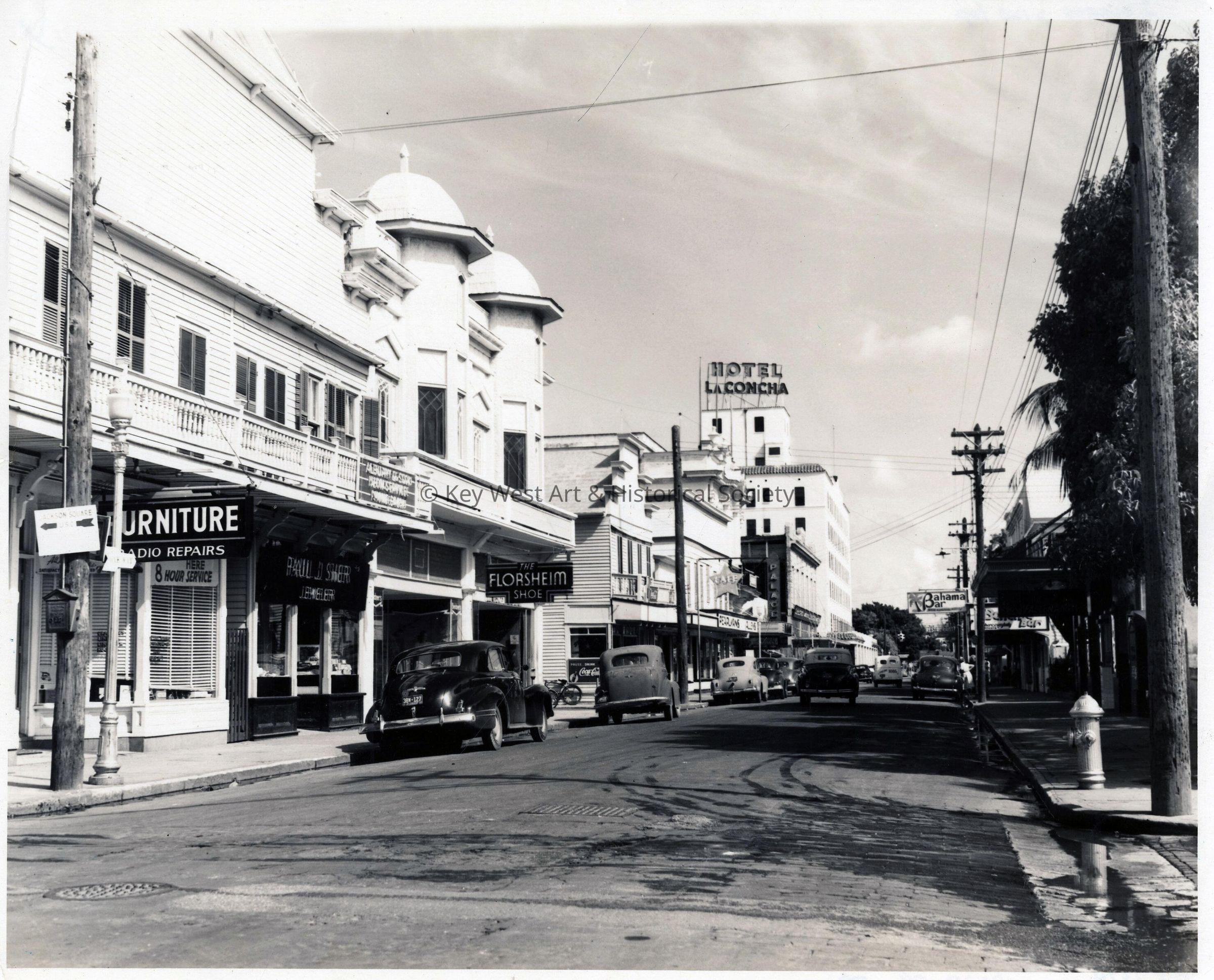 Black and white photograph of the 600 block of Duval Street looking north with the La Concha Hotel in the distance.