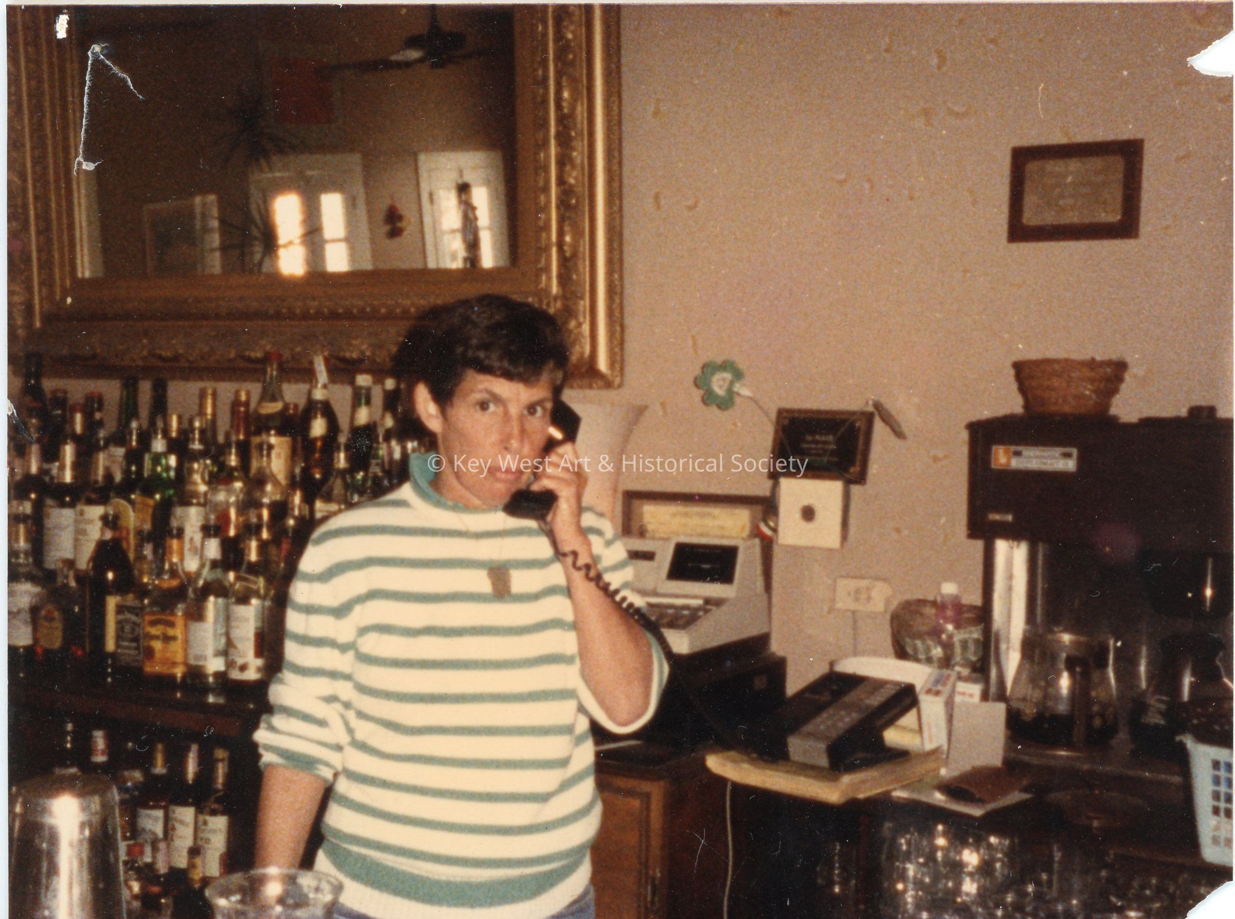 Nancy Loewy on the phone behind the bar at what is ostensibly Michael's upstairs bar in Key West.
