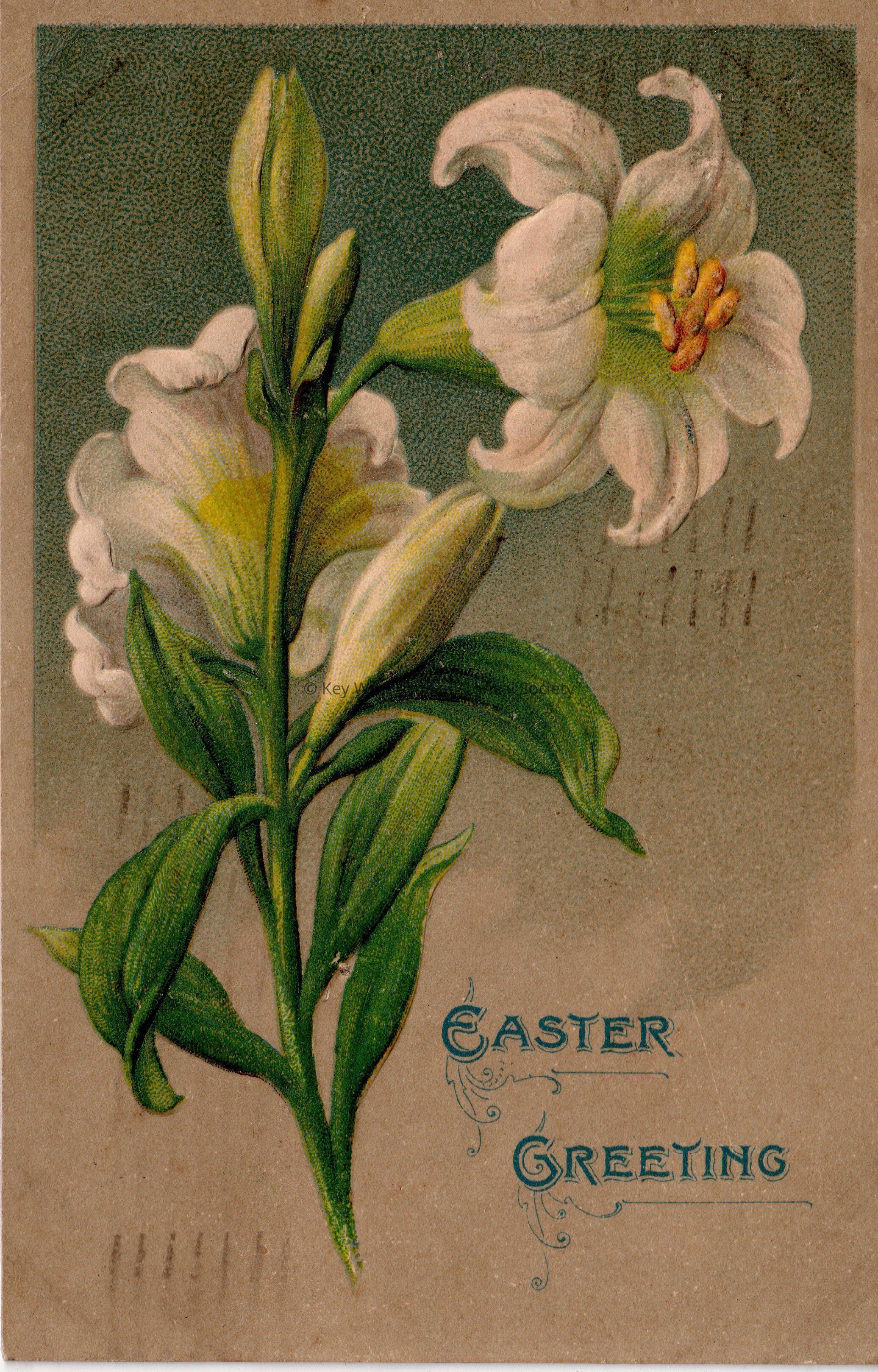 Postcard depicting lilies.  The caption reads, ‘Easter Greeting’.  The message on the verso reads, ‘From Earle’.  The card is addressed to Miss Carolyn Hattrick, 2113 Manton Street, Philadelphia, Pennsylvania, Station D, and is postmarked Burlington, New Jersey, March 26, 1910.Collection