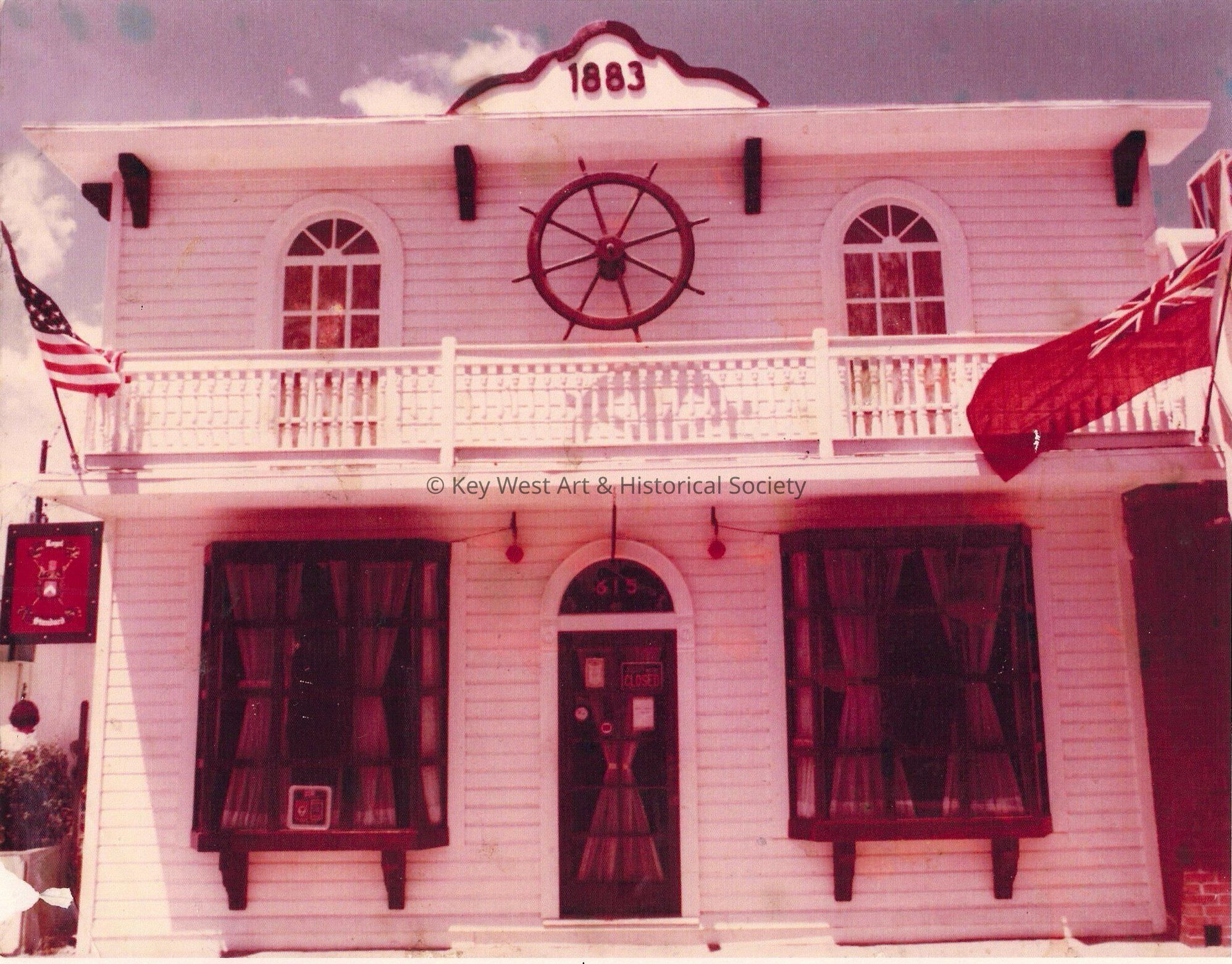 Colored digital copy of a 2 story building located at 615 Duval St. Photo taken in the 1970s. Photo is part of a 'Then and Now' series. Modern photo #2675.