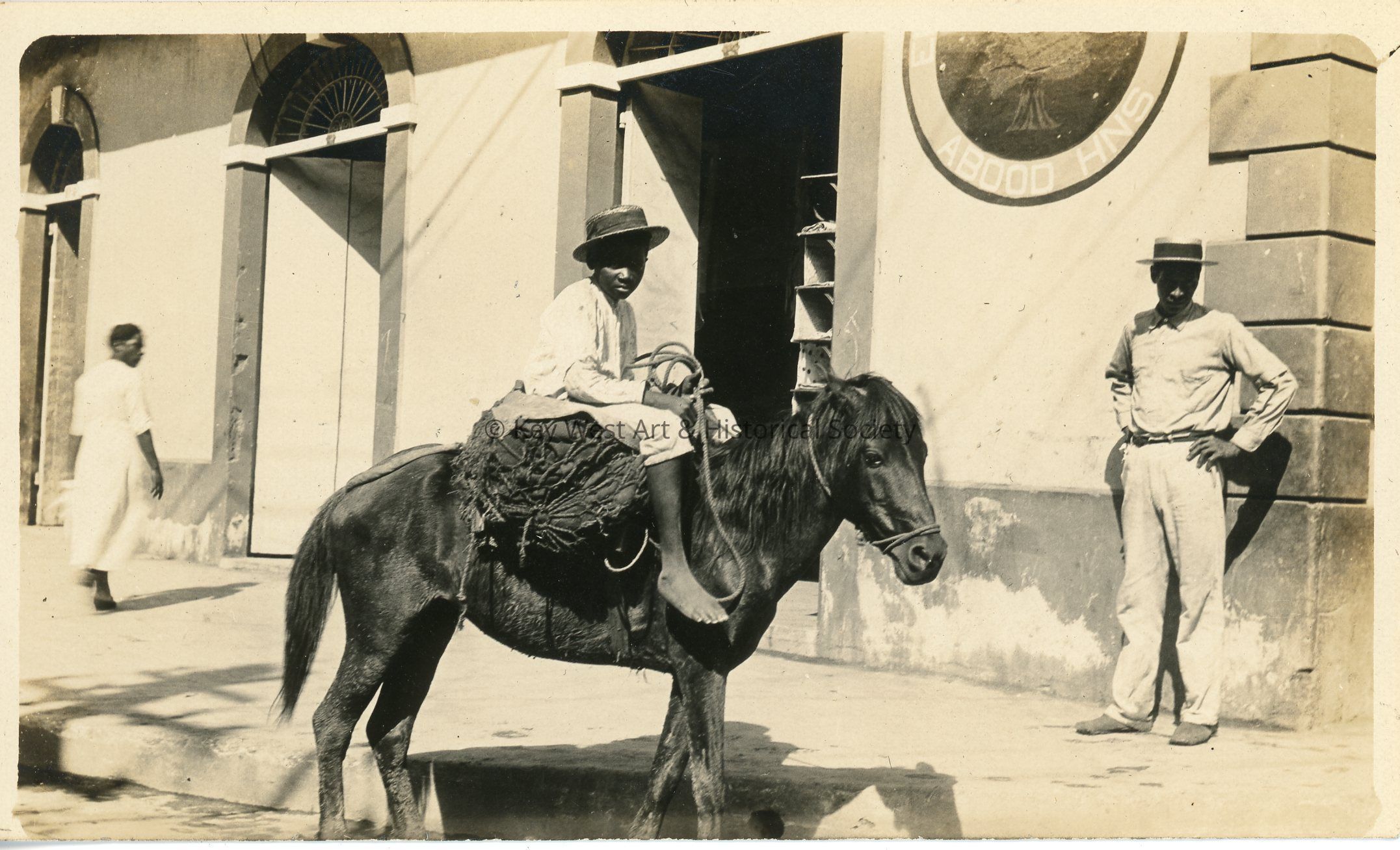 Black and white photograph depicting an unknown boy sitting on a pony in front of a masonry building. The photo is dated December 15, 1914 and has a handwritten note on the back. The photograph was designed to be attached to a postcard backing.Photograph Details
