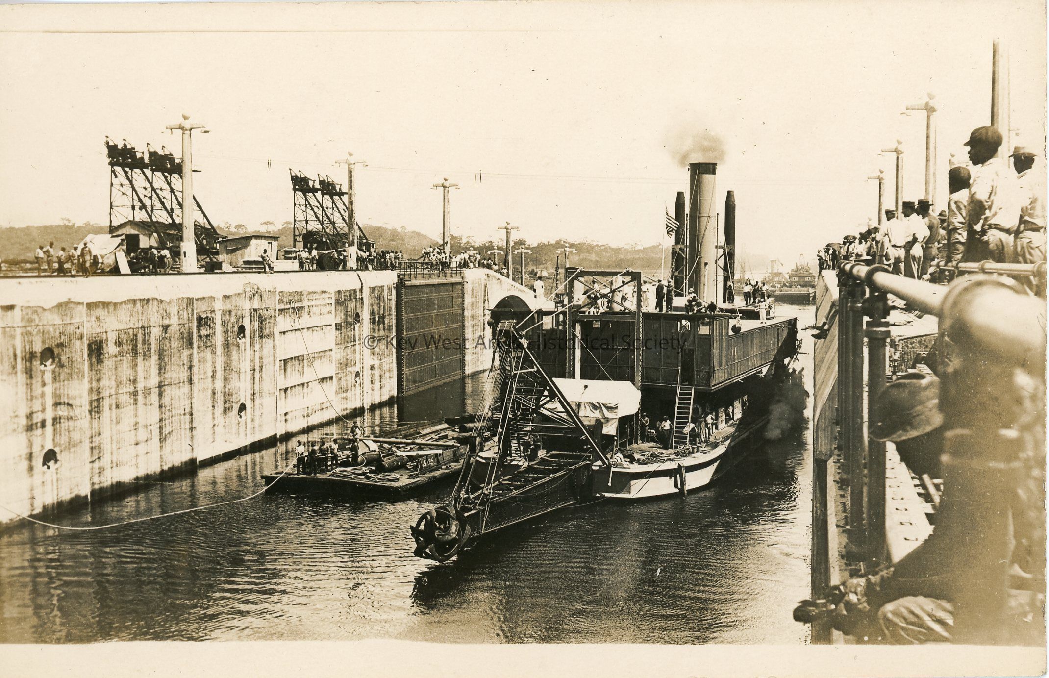 Black and white photograph postcard depicting multiple boats moving through the locks of what is likely the Gatun Locks. A large boat has what appears to be a crane at it's bow. The photograph shows many people watching from the lock walls.Subject