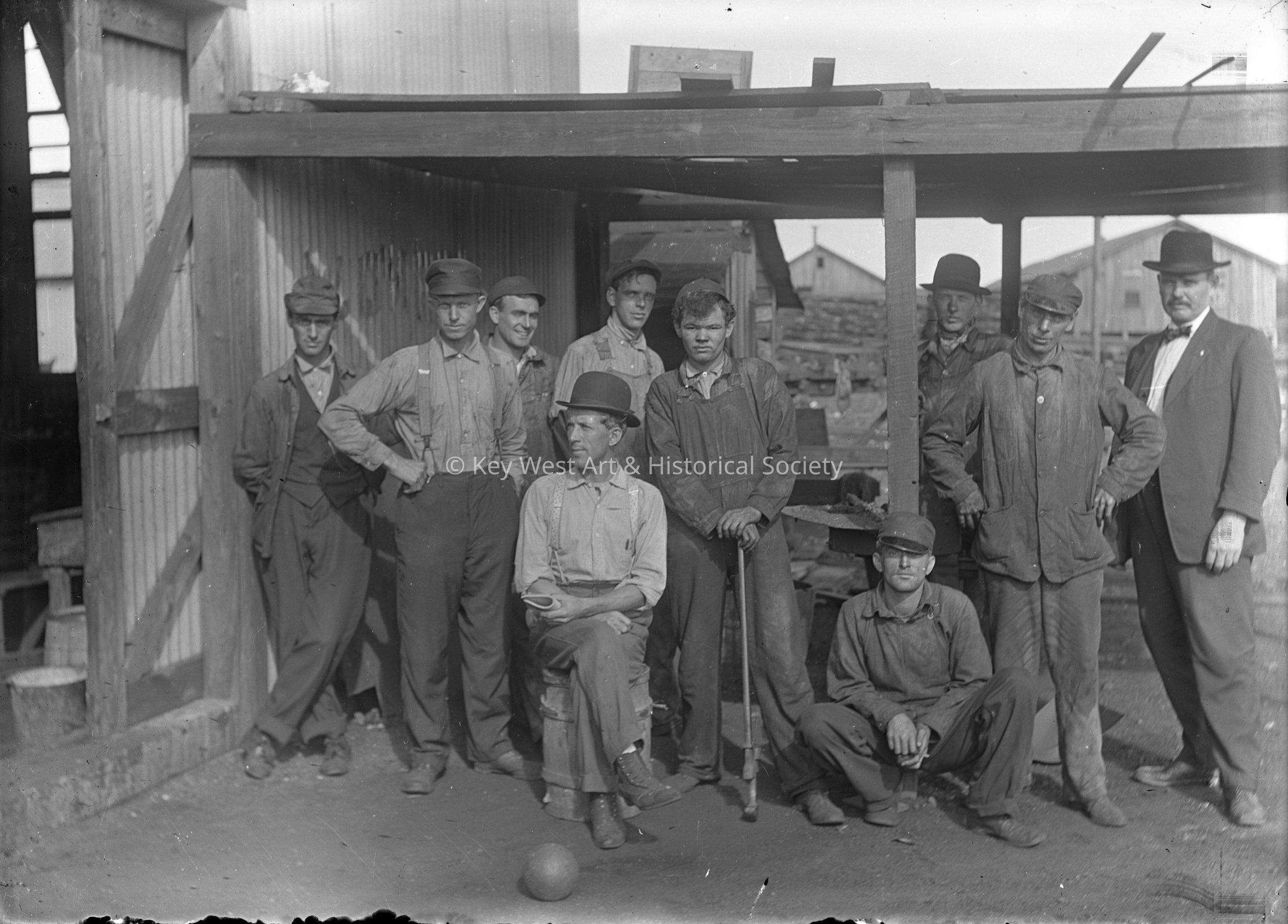 Black and white dry plate glass negative of unknown workers building the Seven Mile Bridge. The image was taken during the construction of Seven Mile Bridge on the Overseas Railway.