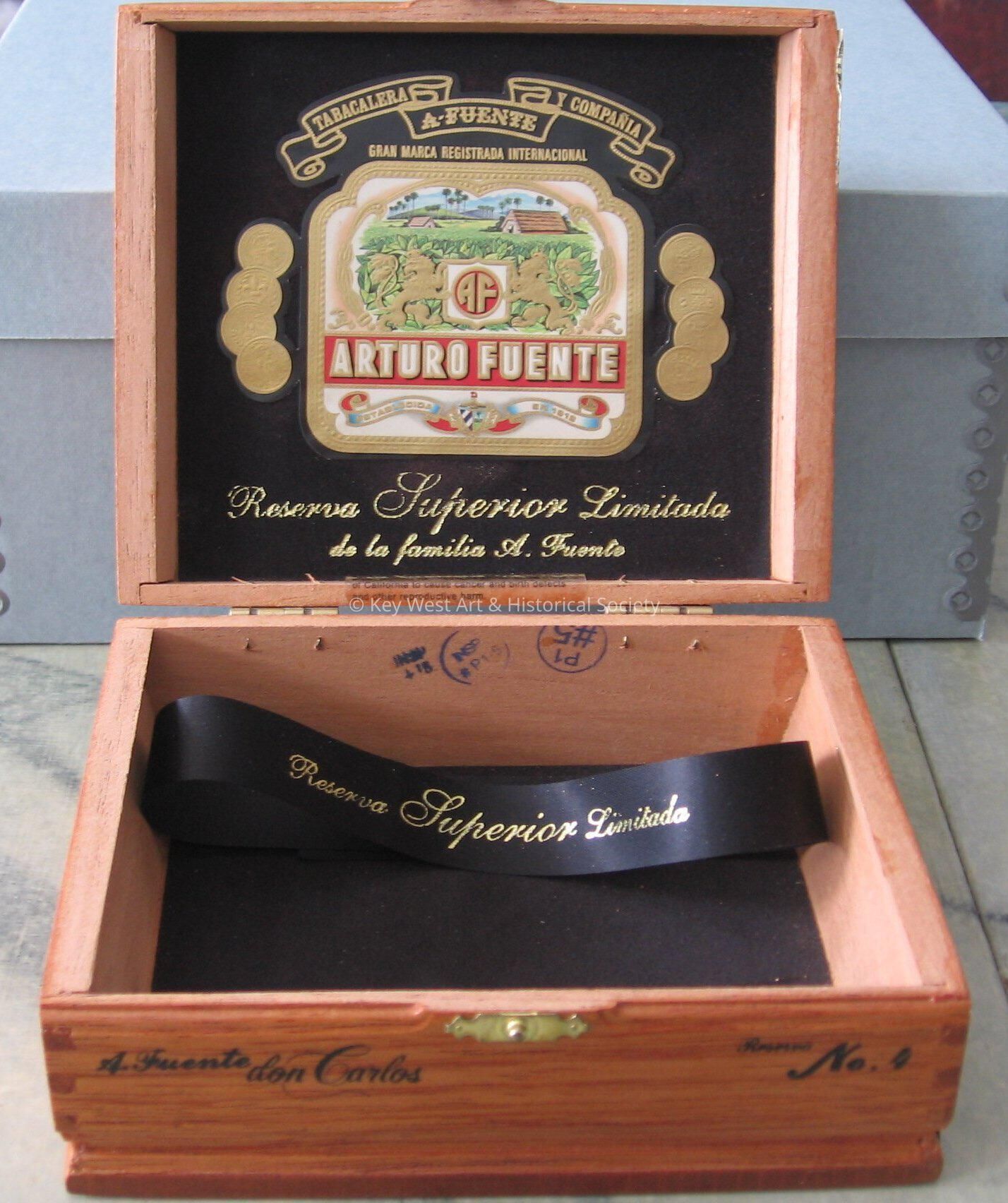Wooden cigar box by A. Fuente in the Dominican Republic. Box reads "A. Fuente don Carlos" "Reserva Superior Limitada de la familia A. Fuente Cosecha 1984" "Hand made in Dominican Republic.