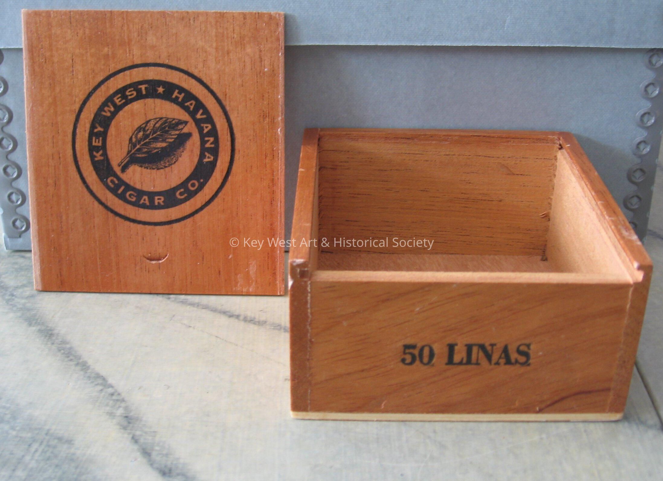 Wooden cigar box. Box reads "Key West - Havana Cigar CO." "50 Linas"