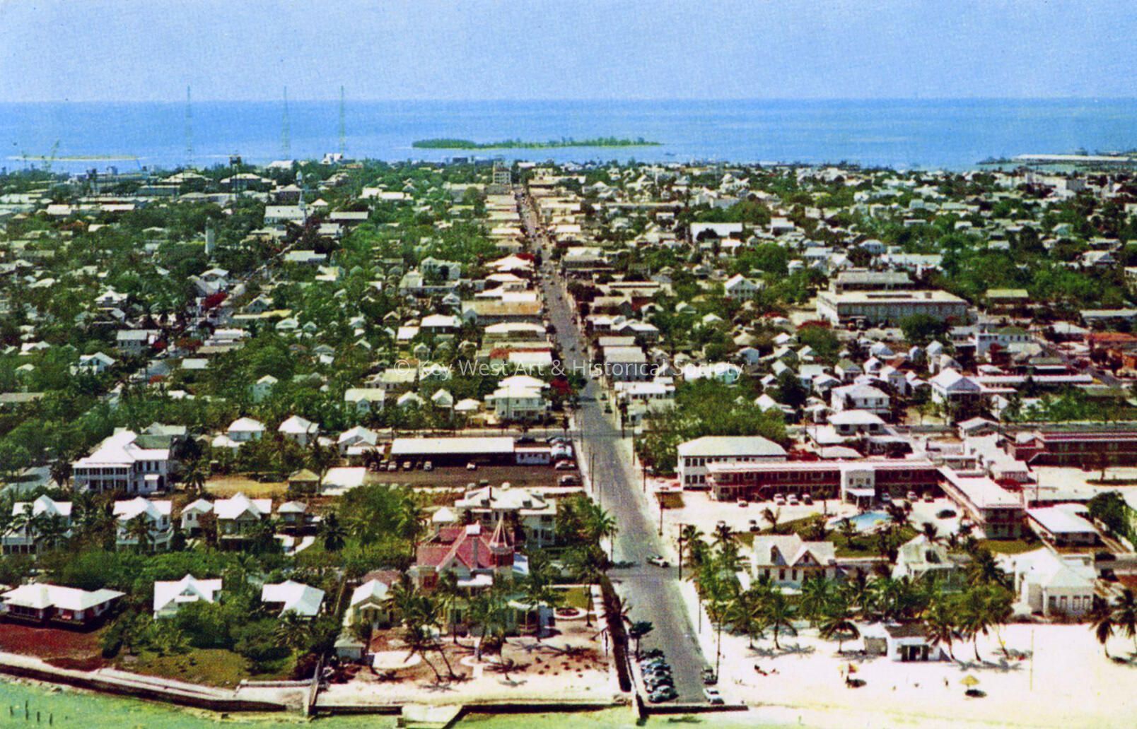 Postcard depicting an aerial view of Key West. Notation on verso, 'Aerial view of Key West, Florida the Southernmost City in the U.S. This view is looking toward the north from the southern end of the island.'Subject Place