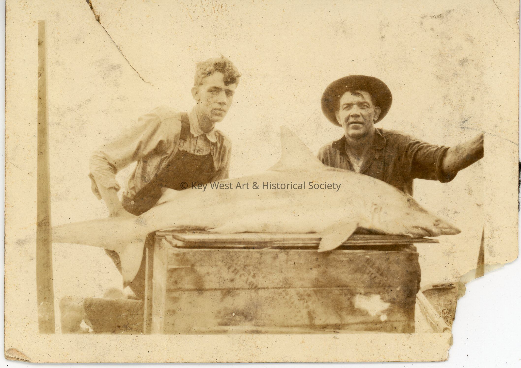 Black and white photograph of two men standing behind a caught shark that is resting on a wooden box. The photo was part of a photograph album began by Victor H. Baker in 1940.