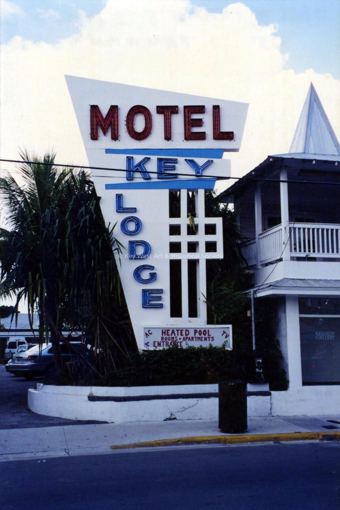Color photograph taken by historian James M. Goode of the Key Lodge Motel sign at the corner of Truman Avenue and Duval Street during a trip to Key West in August 2001. Printed from Roll 15.