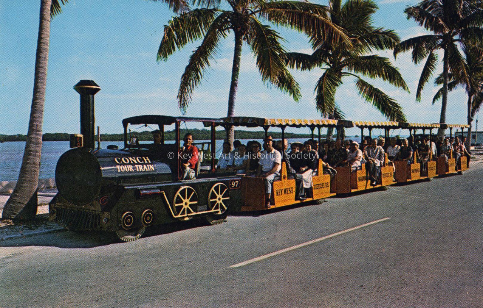 Postcard depicting the Conch Tour Train on North Roosevelt Boulevard. The description on the verso reads, '64-Passenger Conch Tour Train, Key West, Florida. Operates conducted lecture tours daily on the historic Island City. The train passes more than 60 points of interest, running from the Atlantic Ocean to the Gulf of Mexico. Key West is the nation's southernmost city and the only town in the U.S.A. that has never had a frost in the history of the Weather Bureau.'.Subject Place