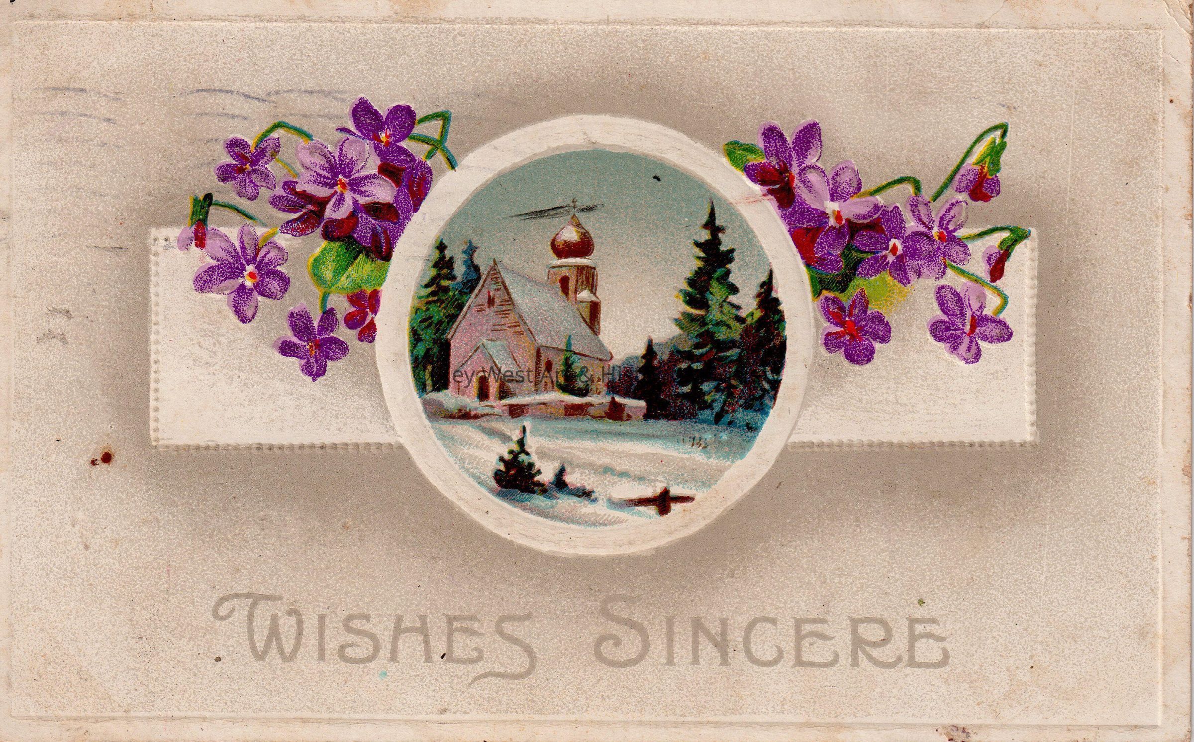 Postcard depicting flowers around a painting of a church.  The caption reads, ‘Wishes Sincere’.  The message on the verso reads, 'With best wishes, Alice'.  The card is addressed to Miss Carolyn Hattrick, 2113 Manton Street, Philadelphia, Pennsylvania, and is postmarked Camden, New Jersey, September 14, 1913.Collection