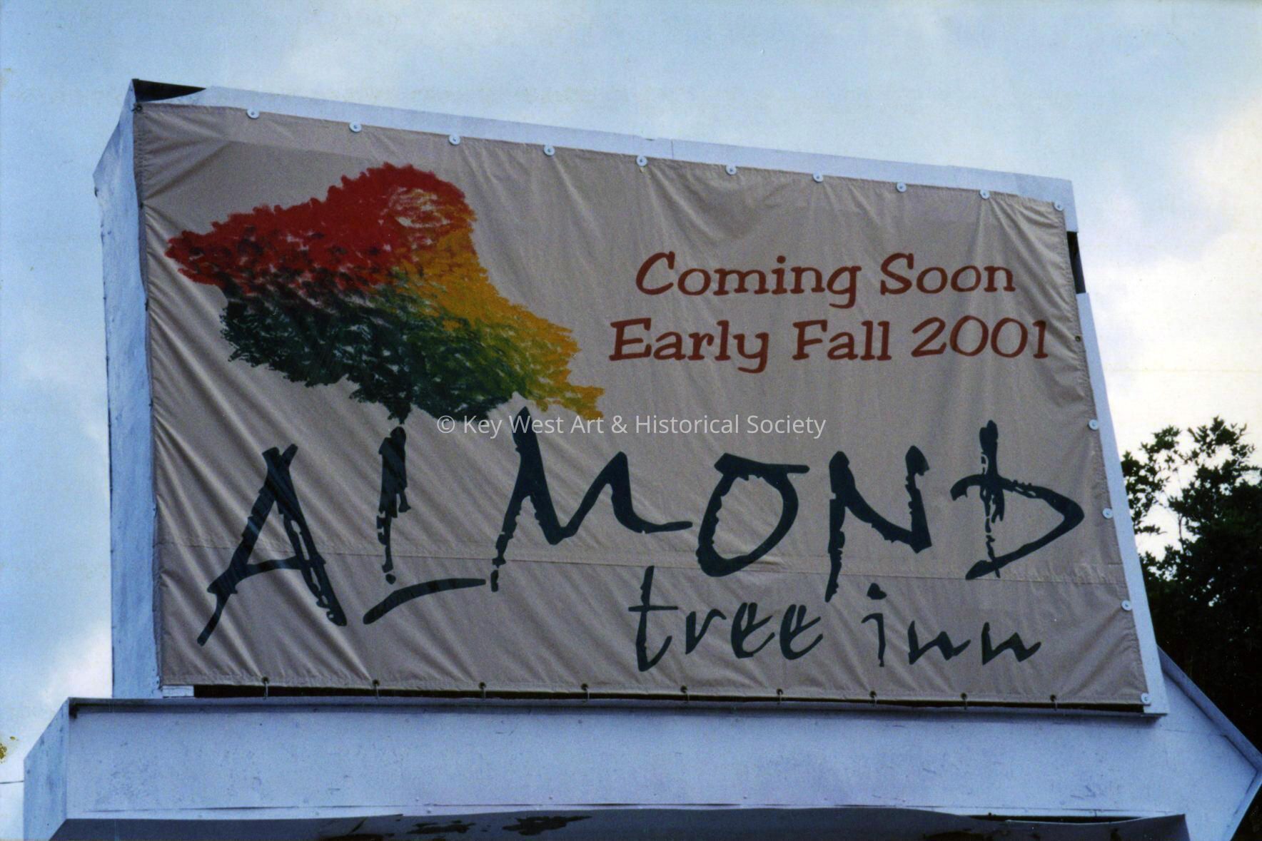 Color photograph taken by historian James M. Goode of the Almond Tree Inn sign at 512 Truman Avenue during a trip to Key West in August 2001. Printed from Roll 15.