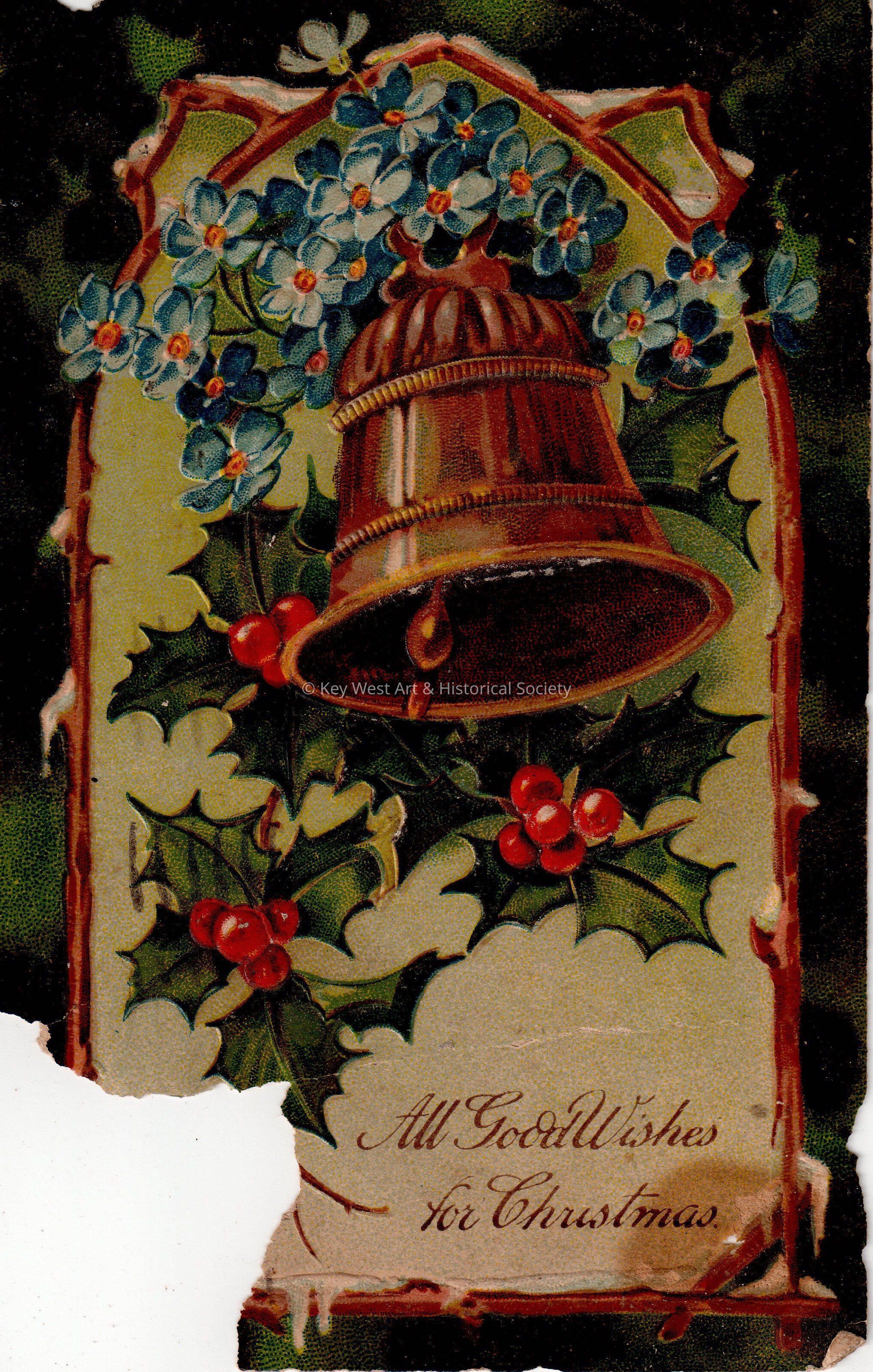 Postcard depicting a bell, holly sprigs, and flowers. The caption reads, ‘All Good Wishes for Christmas’. The message on the verso reads, ‘71 Central Park West, New York, December 22, 1909, My dear Uncle and cousin, I wish you a Merry Christmas & a Happy New Year. I hope you are well. Why don’t you answer my letter? With love & best regards, I remain your niece and cousin, Bertha Dahler.’ The card is addressed to Mr. John Scheurer, Key West, Florida, and is postmarked New York, New York, December 22, 1909.Collection