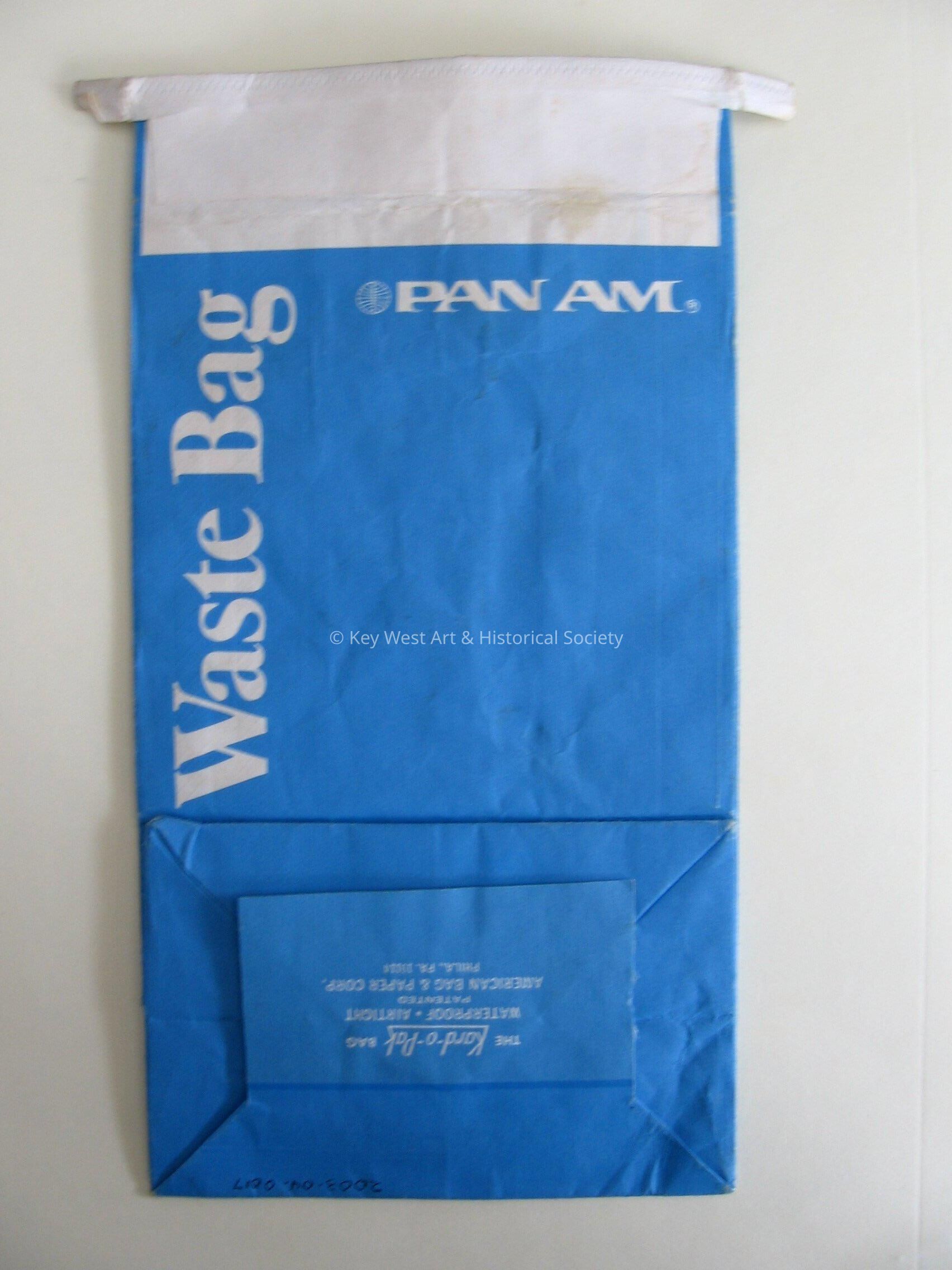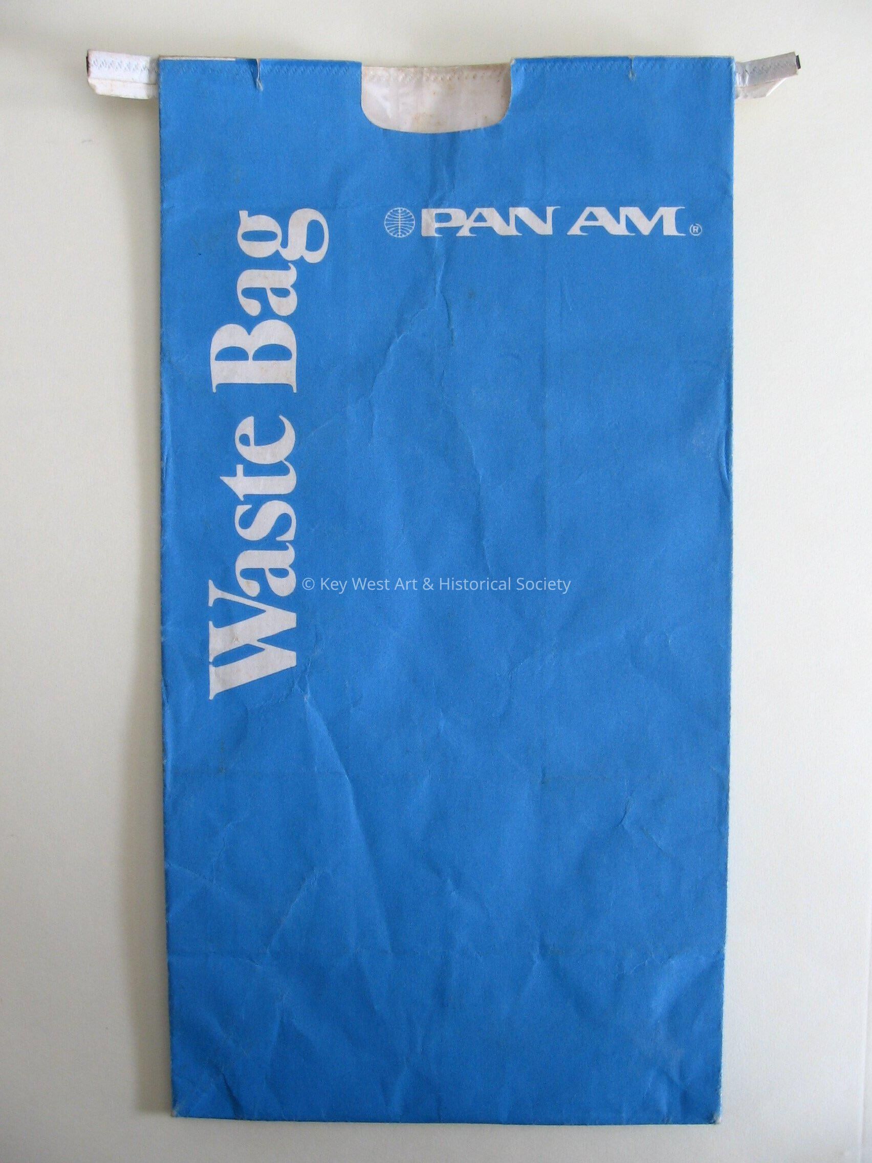 Pan American Airways blue and white waste bag. Pan Am logo on front and back.