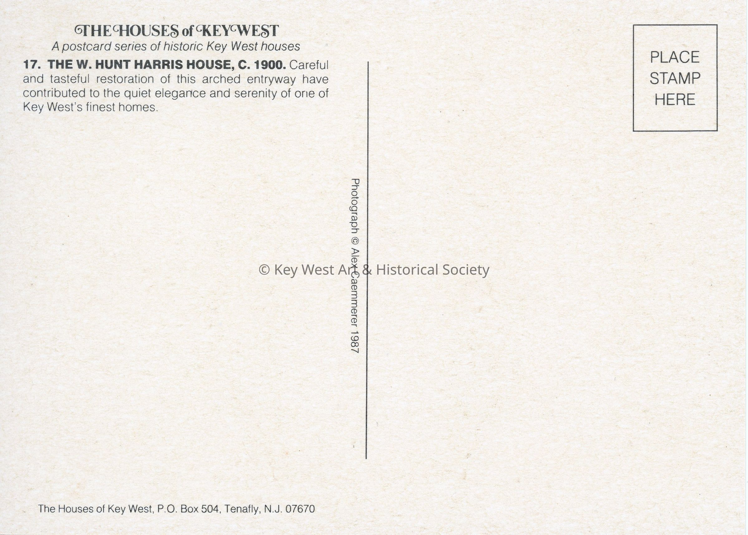 Postcard belonging to 'The Houses of Key West' series depicting the W. Hunt Harris House located at 425 Caroline Street. Notation on verso reads '17. THE W. HUNT HARRIS HOUSE, C. 1900. Careful and tasteful restoration of this arched entryway have contributed to the quiet elegance and serenity of one of Key West's finest homes.'Subject Place