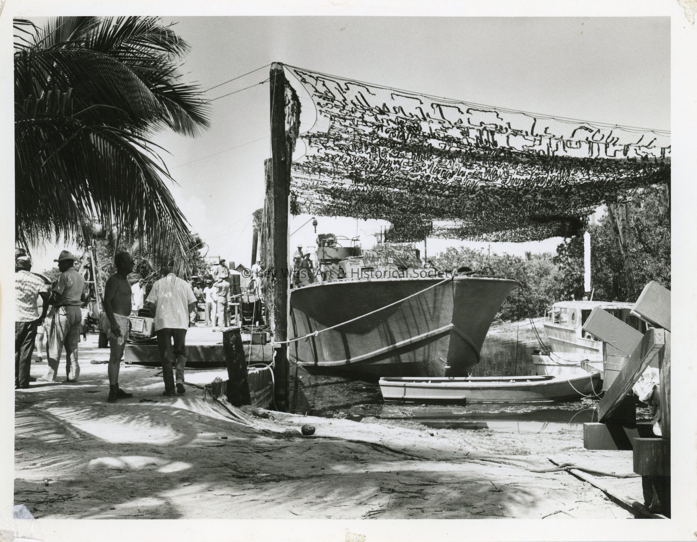 Black and white photograph of cast and crew on the set of the movie 'PT 109' on Munson Island. The film was directed by Leslie H. Martinson and stars Cliff Robertson as Lieutenant Junior Grade John F. Kennedy.