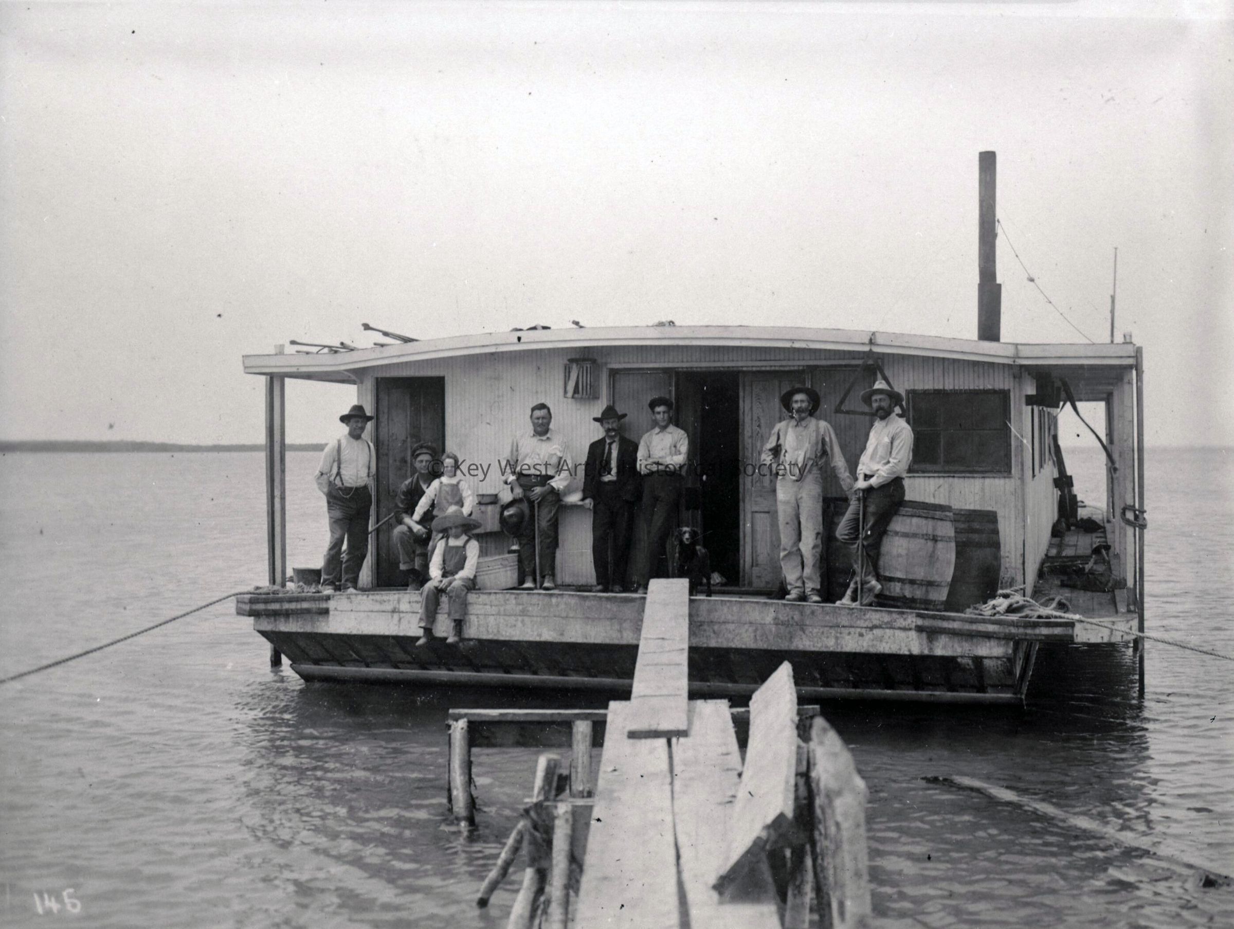 Black and white negative of Florida East Coast Railway construction workers standing onboard a quarter boat.