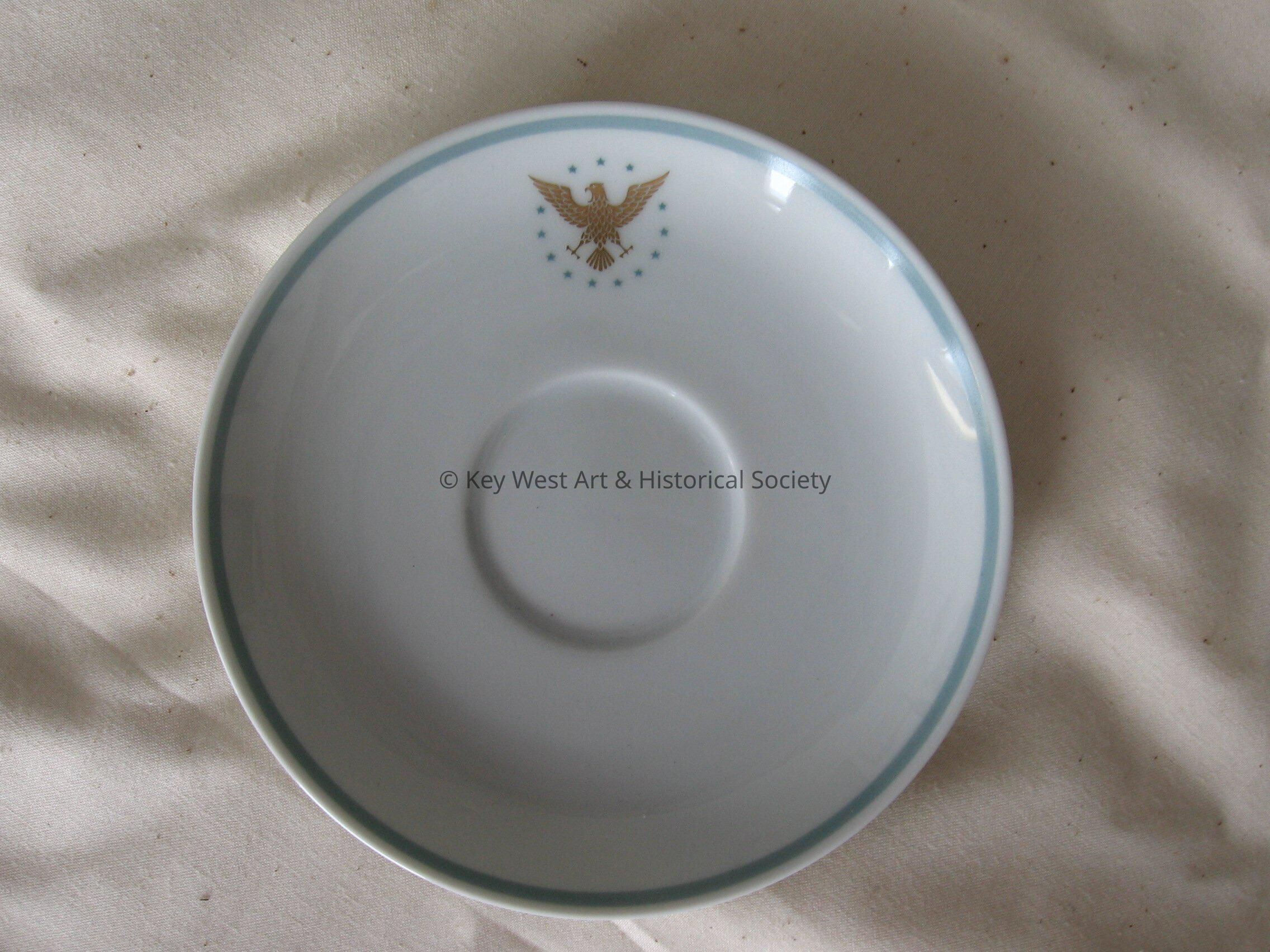 Pan American Airways Noritake china saucer with a light blue stripe around the perimeter. A gold eagle with stars surrounding it printed at the top. Paired with 2003.04.0023G.