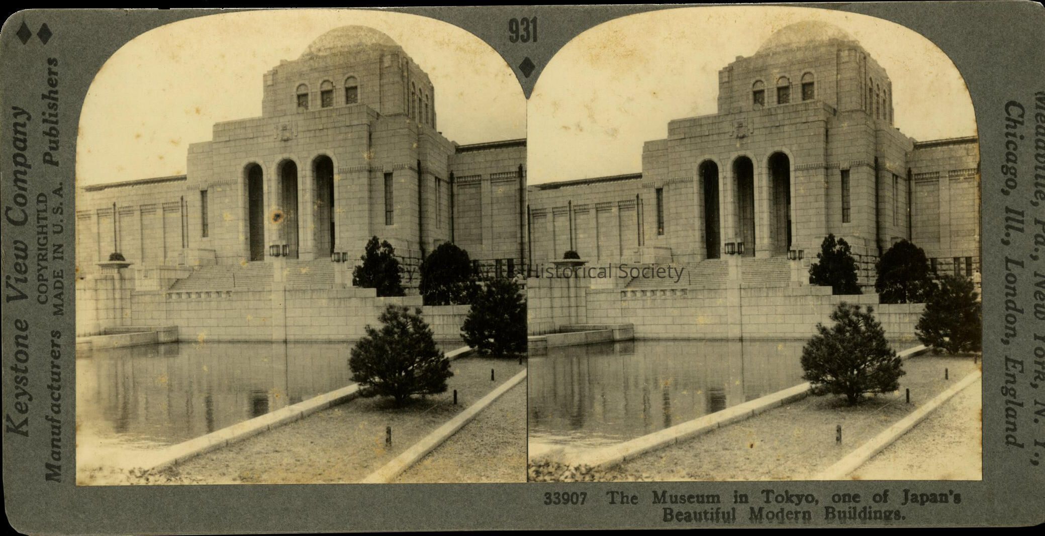 Black and white stereoview of the Museum in Tokyo, One of Japan's Beautiful Modern Buildings. Extensive description printed on verso.