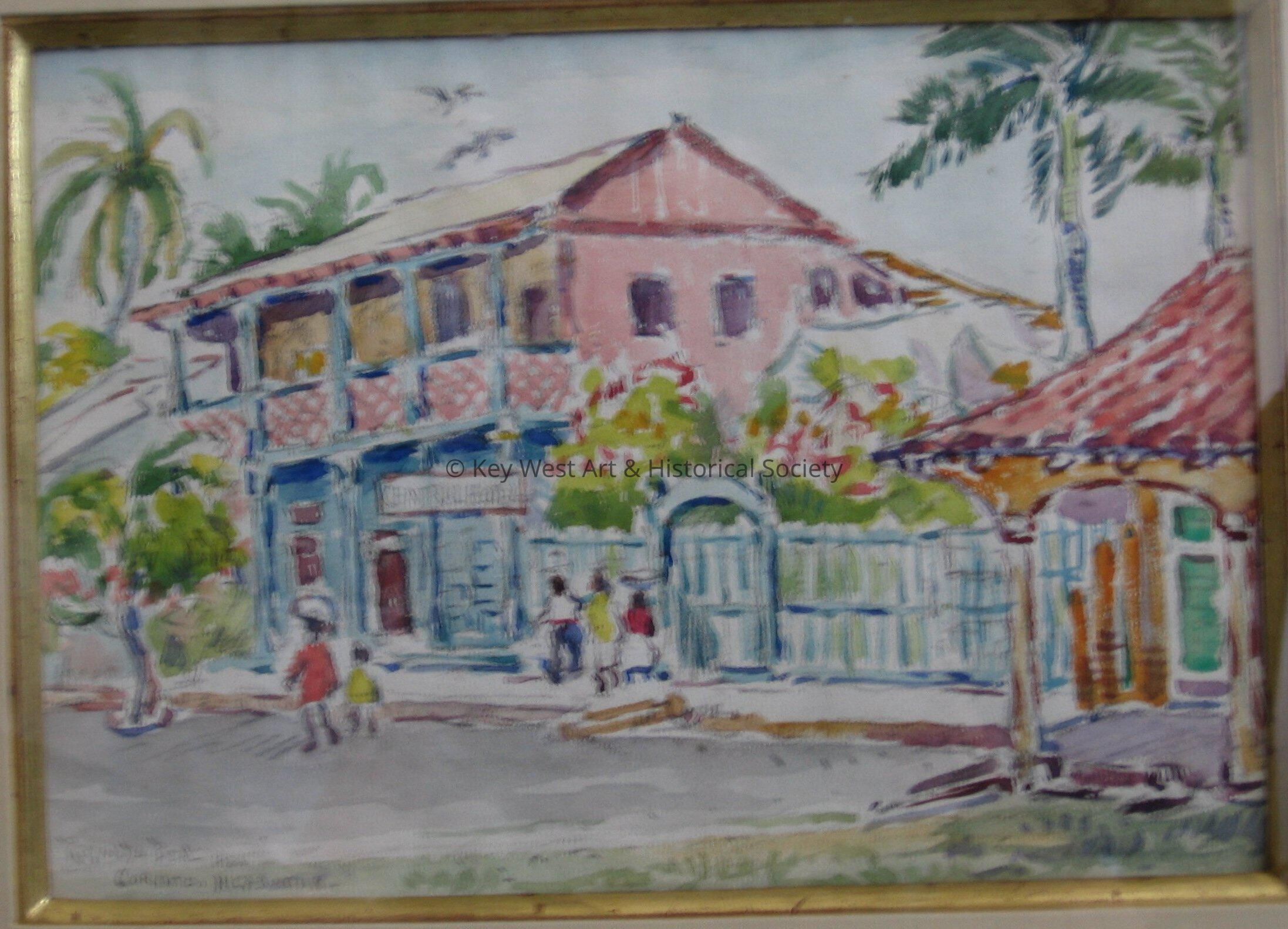Watercolor on paper. Image of the Central Hotel with people walking down the street in front of it. Framed and matted.Collection