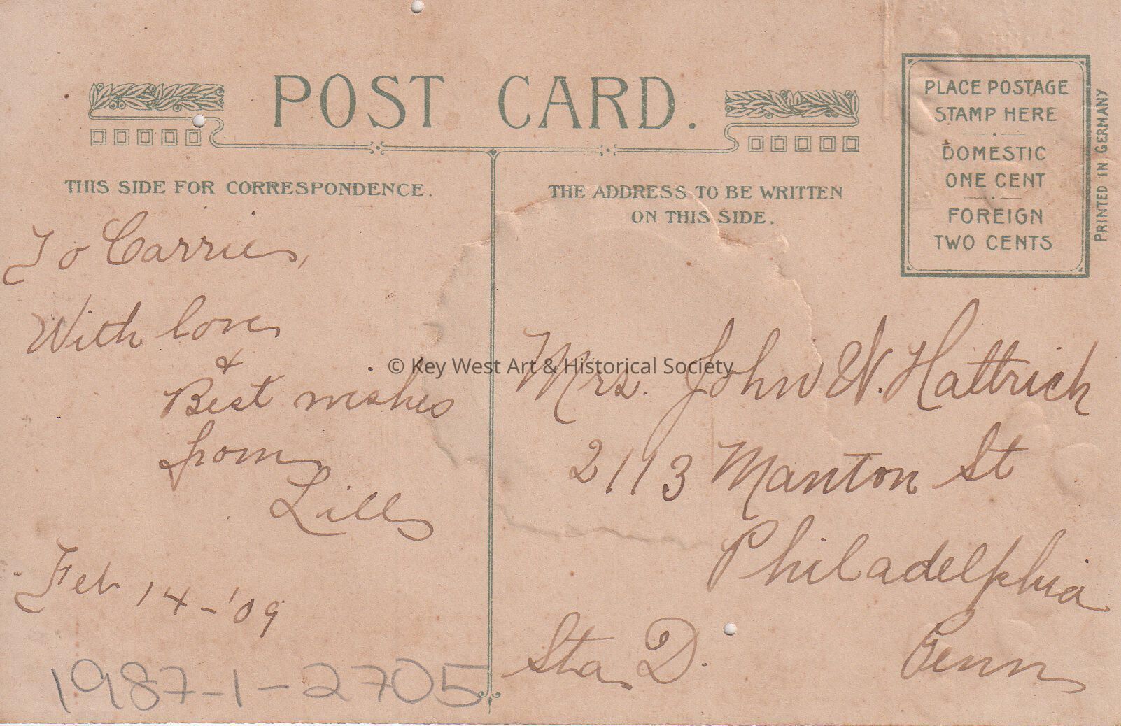 Postcard depicting a woman in a hat surrounded by flowers. The caption reads, ‘True Love’. The message on the verso reads, ‘To Carrie with love and best wishes from Lill, February 14, 1909'. The card is addressed to Mrs. J.W. Hattrick, 2113 Manton Street, Station D, Philadelphia, Pennsylvania.Collection
