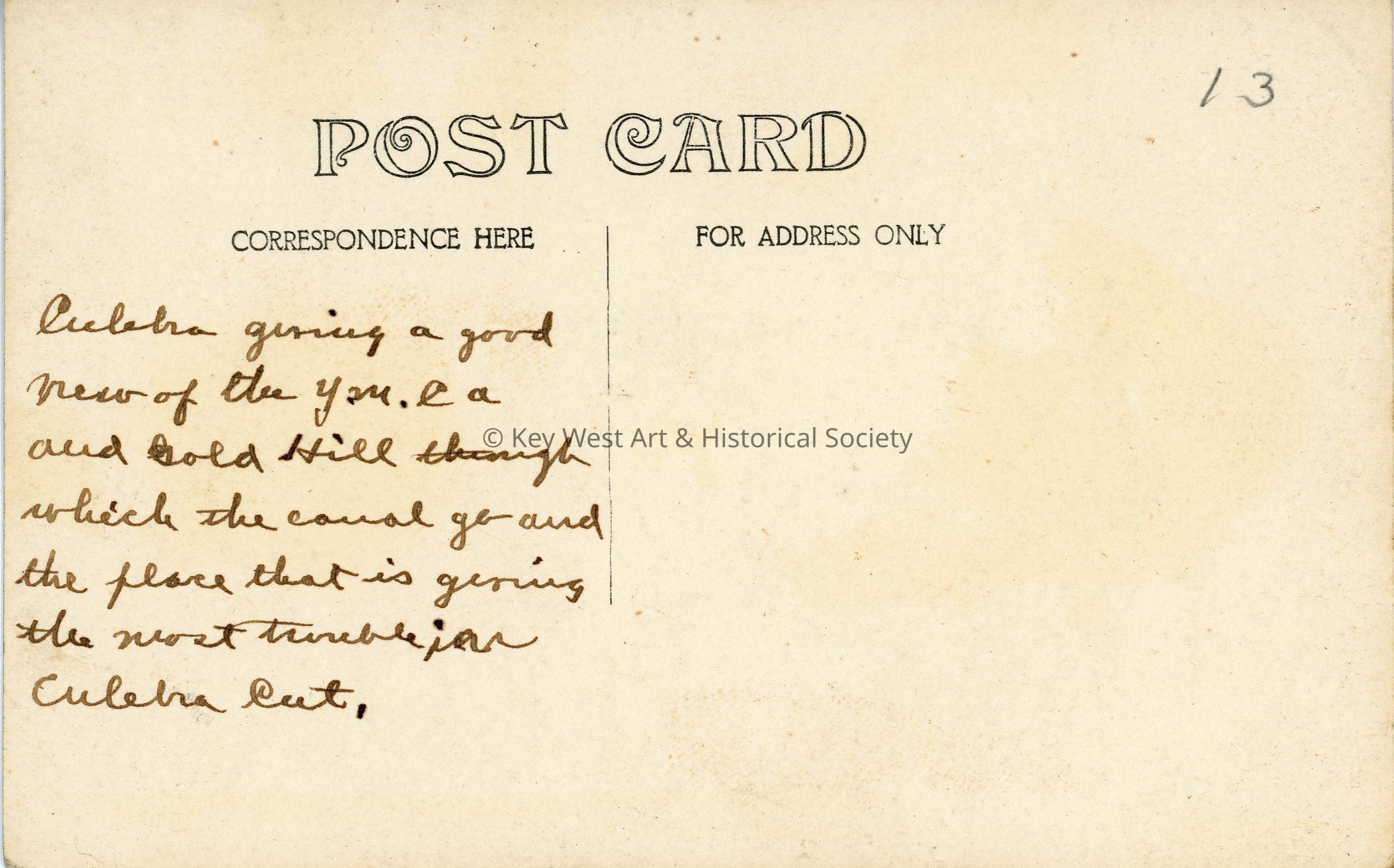 Black and white photograph postcard depicting housing for those working on the Culebra Cut. The Y.M.C.A. can be seen on the left and bachelor quarters are to the right. Gold Hill is in the background. Verso has handwritten note.Subject