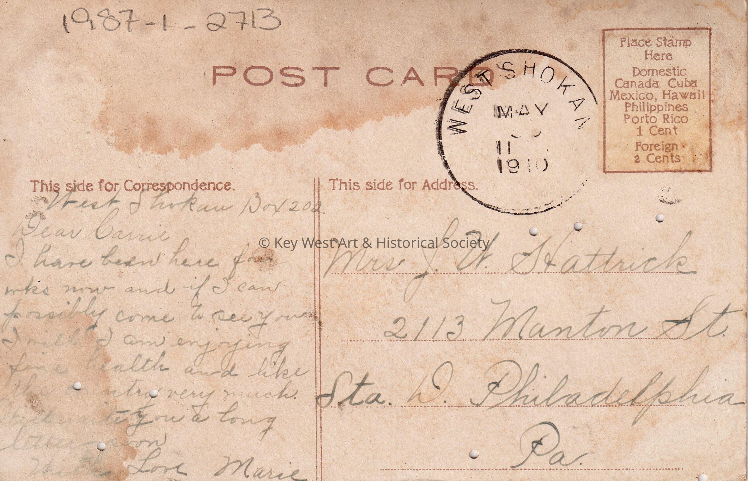 Dear Carrie, I have been here four weeks now and If I can possibly come to see you I will.  I am enjoying fine health and like the country very much.  Will write you a long letter soon.  With Love, Marie.Language