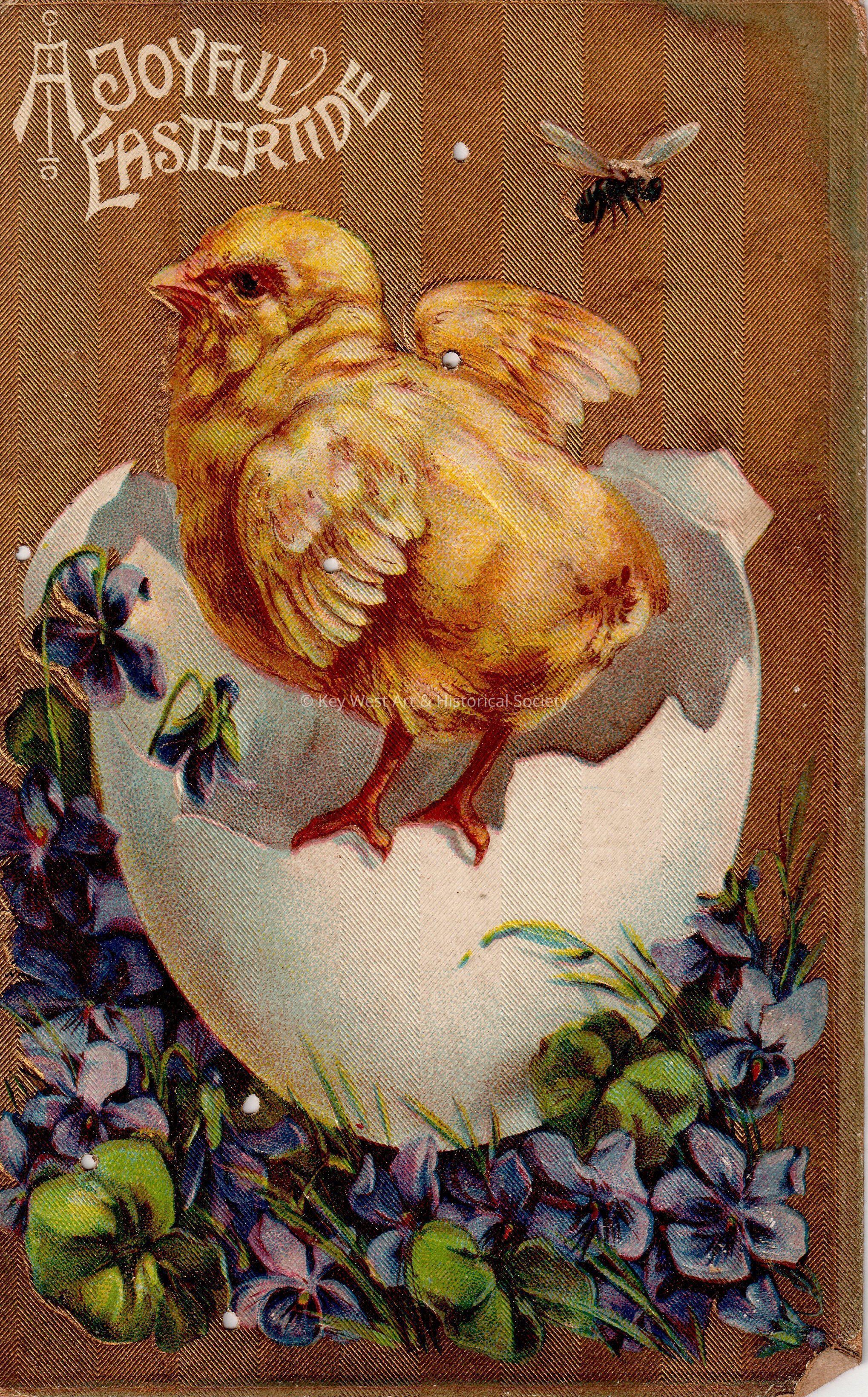 Postcard depicting a chick hatching from an egg near violets and a bee.  The caption reads, ‘A Joyful Eastertide’.  The message on the verso reads, ‘I will write you soon.  Lillie Pinder’s Father was buried Sunday afternoon.  You know who I mean, Lillie Thompson that died.’  The card is addressed to Carrie from Sarah.Collection