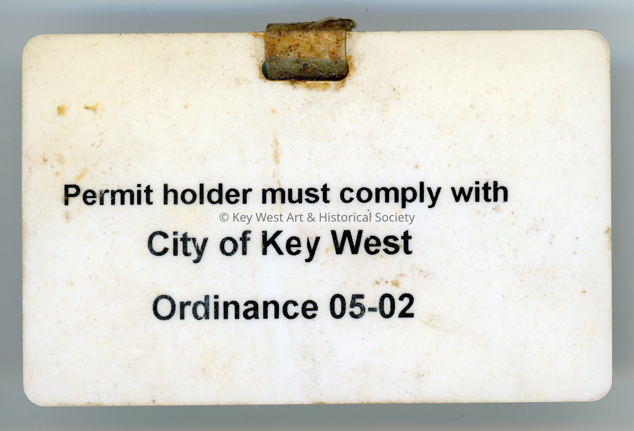 A clip on street performer permit badge issued by the City of Key West belonging to William McKinzie. The badge gave McKinzie permission to play a musical instrument on city streets through December 15, 2009.Collection