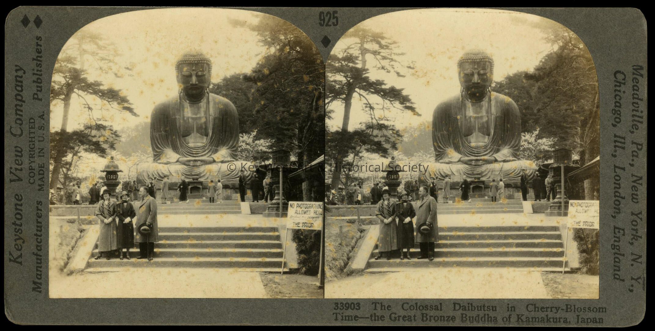 Black and white stereoview of the colossal daibutsu in cherry-blossom time - the great bronze Buddha of Kamakura, Japan. Extensive description printed on verso.