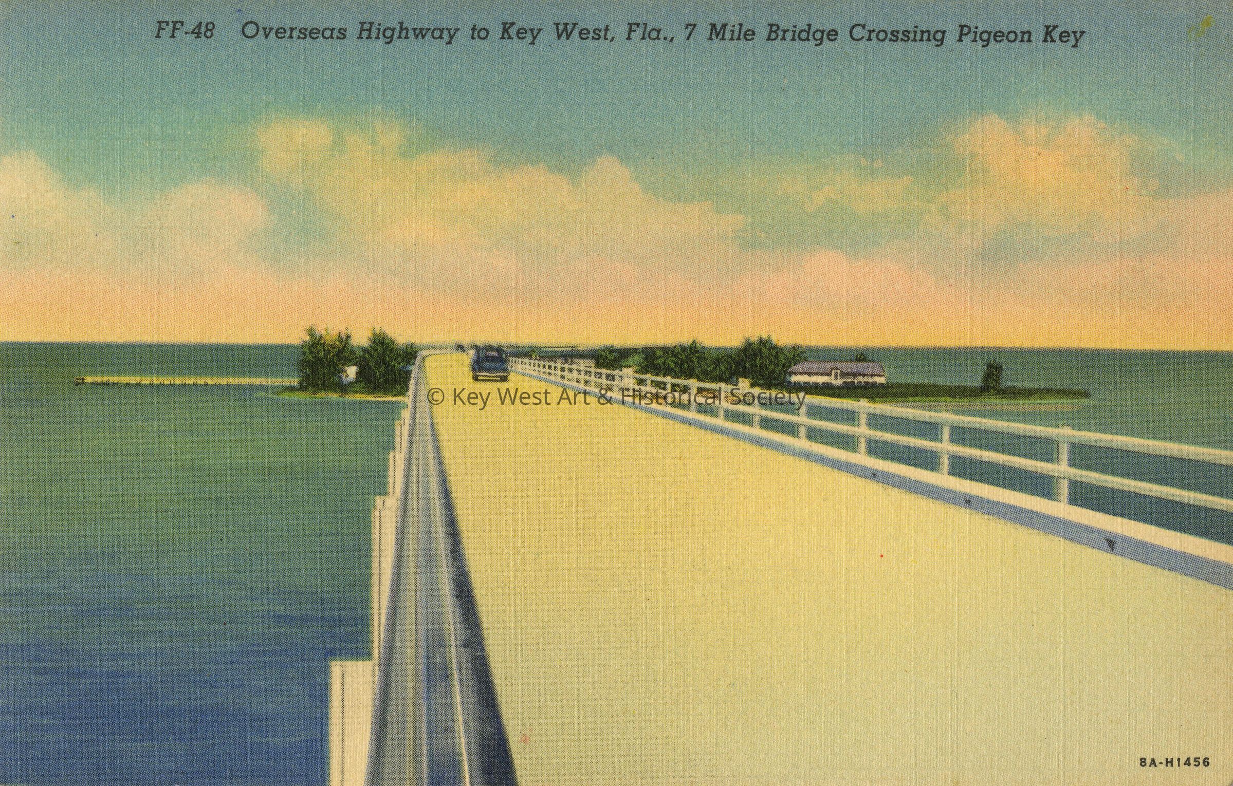 Postcard depicting the Seven Mile Bridge crossing Pigeon Key.  The caption reads, ‘Overseas Highway to Key West, Fla.  7 Mile Bridge Crossing Pigeon Key.‘Subject Place
