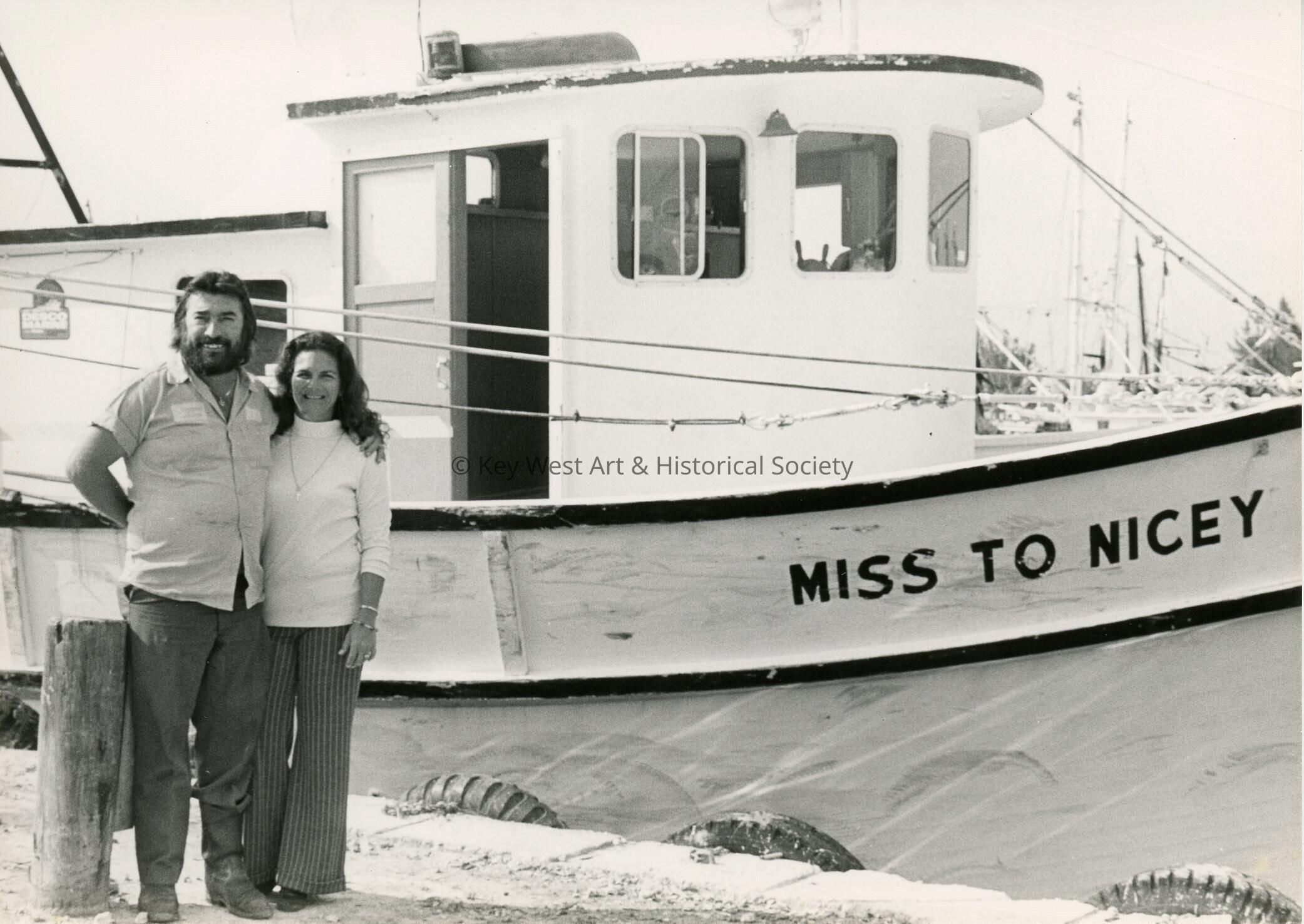 Black and white photograph of an unknown couple standing alongside a shrimp boat name MISS TO NICEY.