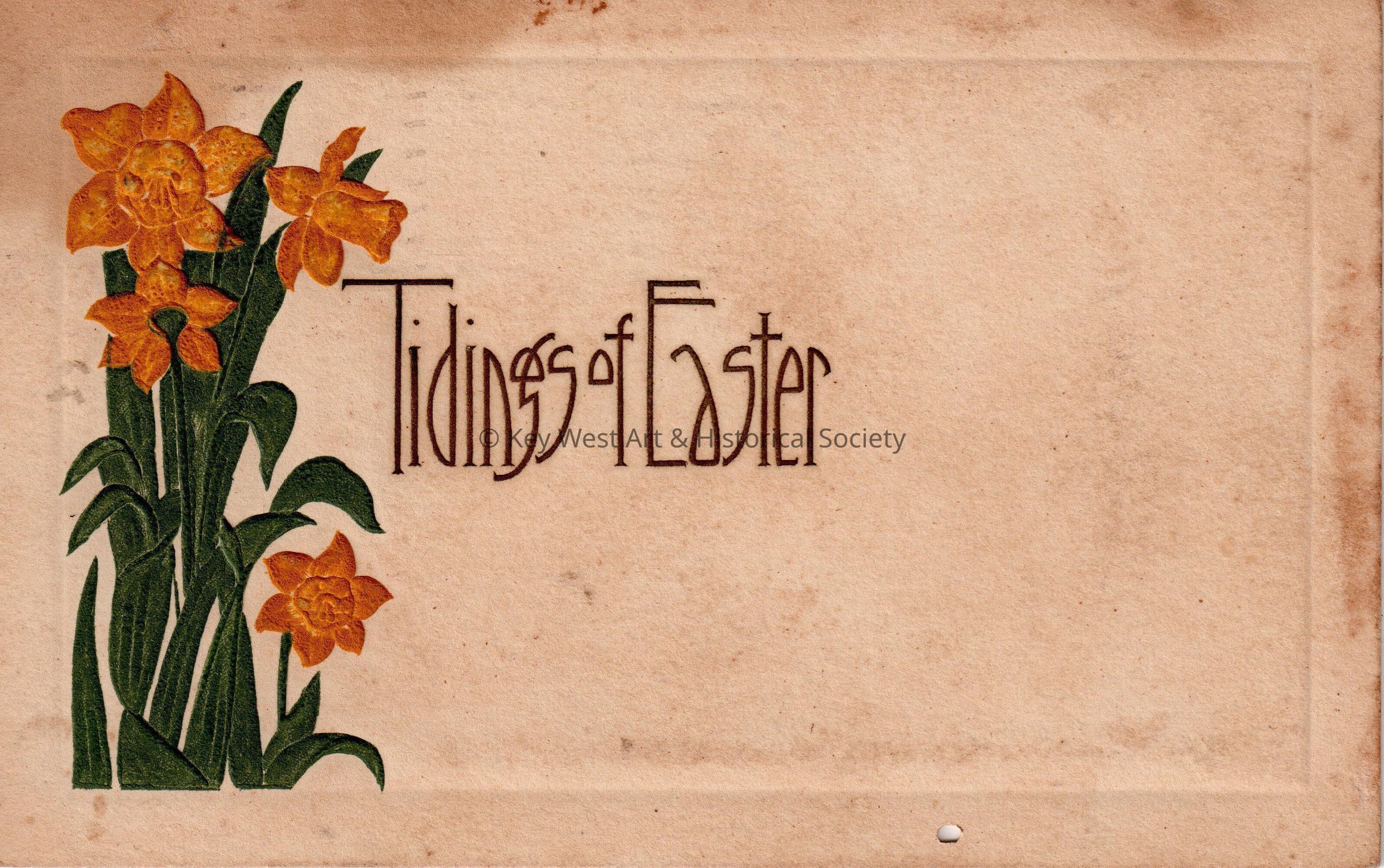 Postcard depicting daffodils with a caption that reads, ‘Tidings of Easter’. The message on the verso reads, 'W.H. Wychoff.’ The card is addressed to Mr. John W. Hattrick, 2113 Manton Street, City, and is postmarked Philadelphia, April 5, 1912.Collection