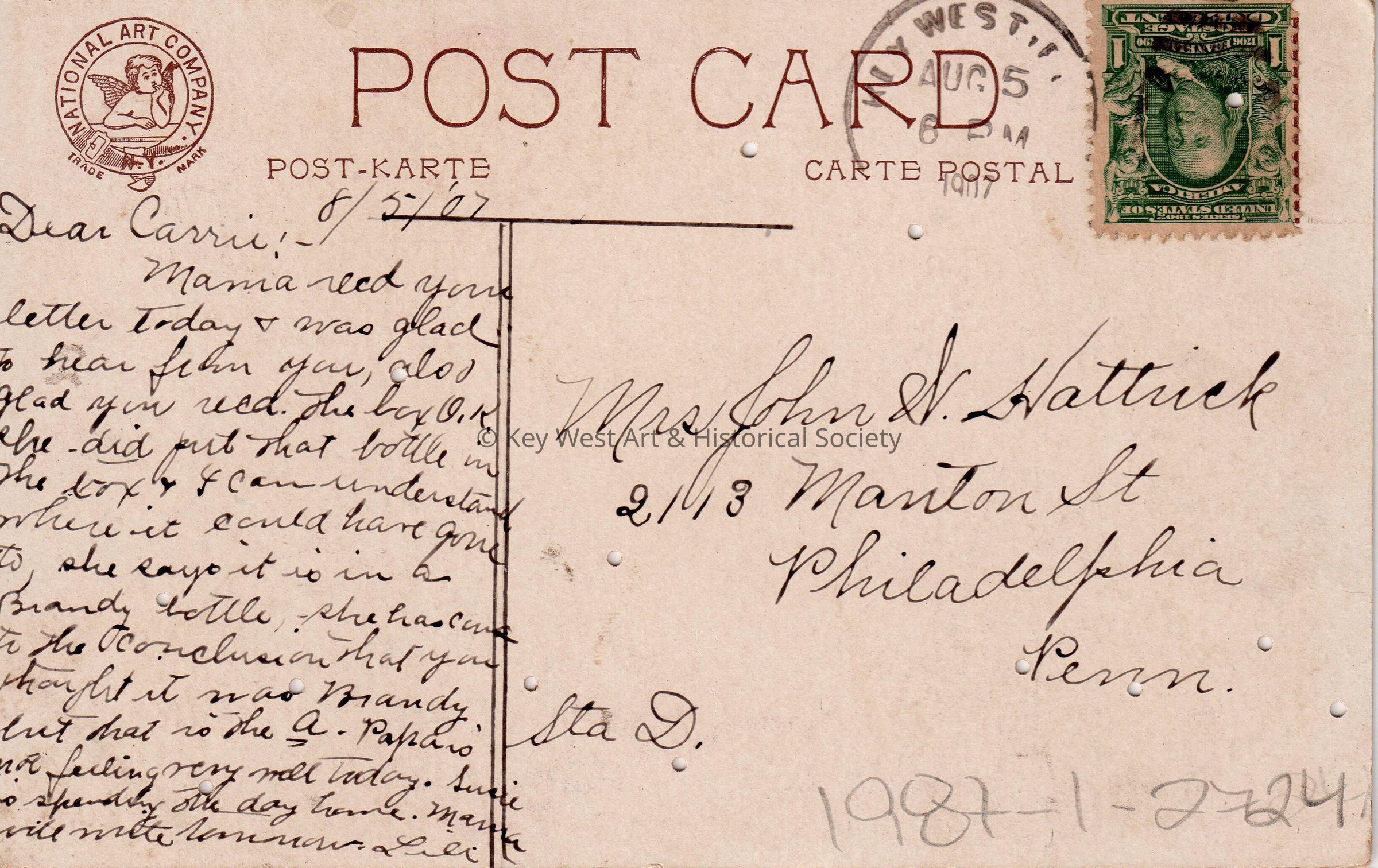 Postcard depicting an American flag and another flag with two clasping hands over water. The message on the front reads, ‘from Lillian’. The message on the verso reads, ‘August 5, 1907. Dear Carrie: Mama received your letter today & was glad to hear from you. Also glad you received the box o.k. She did put that bottle in the box & I can't understand where it could have gone to, she says it is in a brandy bottle. She has come to the conclusion that you thought it was brandy but that is the A. Papa is not feeling very well today. Susie is spending the day home. Mama will write tomorrow. Lill.’ The card is addressed to Mrs. John W. Hattrick, 2113 Manton Street, Philadelphia, Pennsylvania Station D, and is postmarked Key West, August 5, 1907.Collection