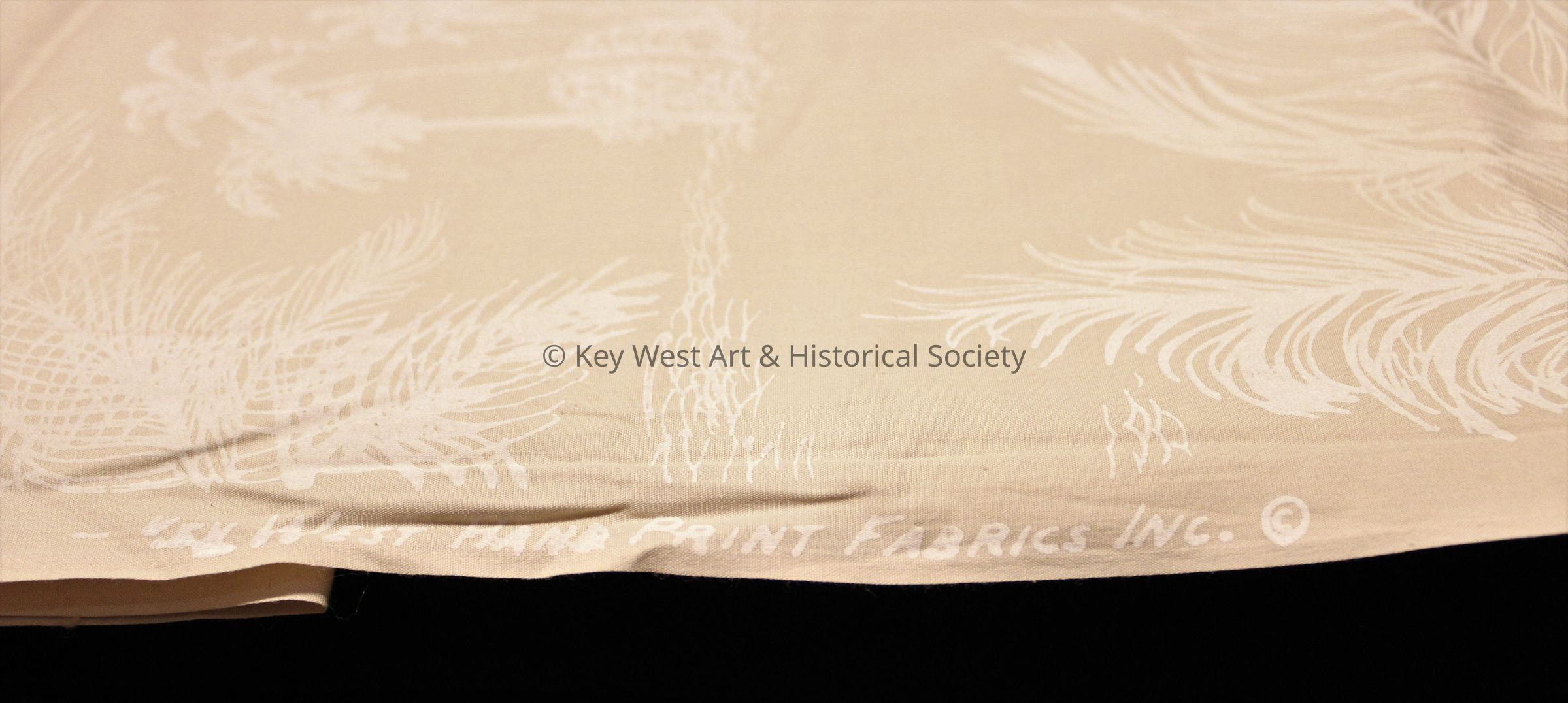 Tan and white cotton canvas Key West toile made by Key West Hand Print Fabrics. The print includes prominent buildings, ships, and the lighthouse.Collection