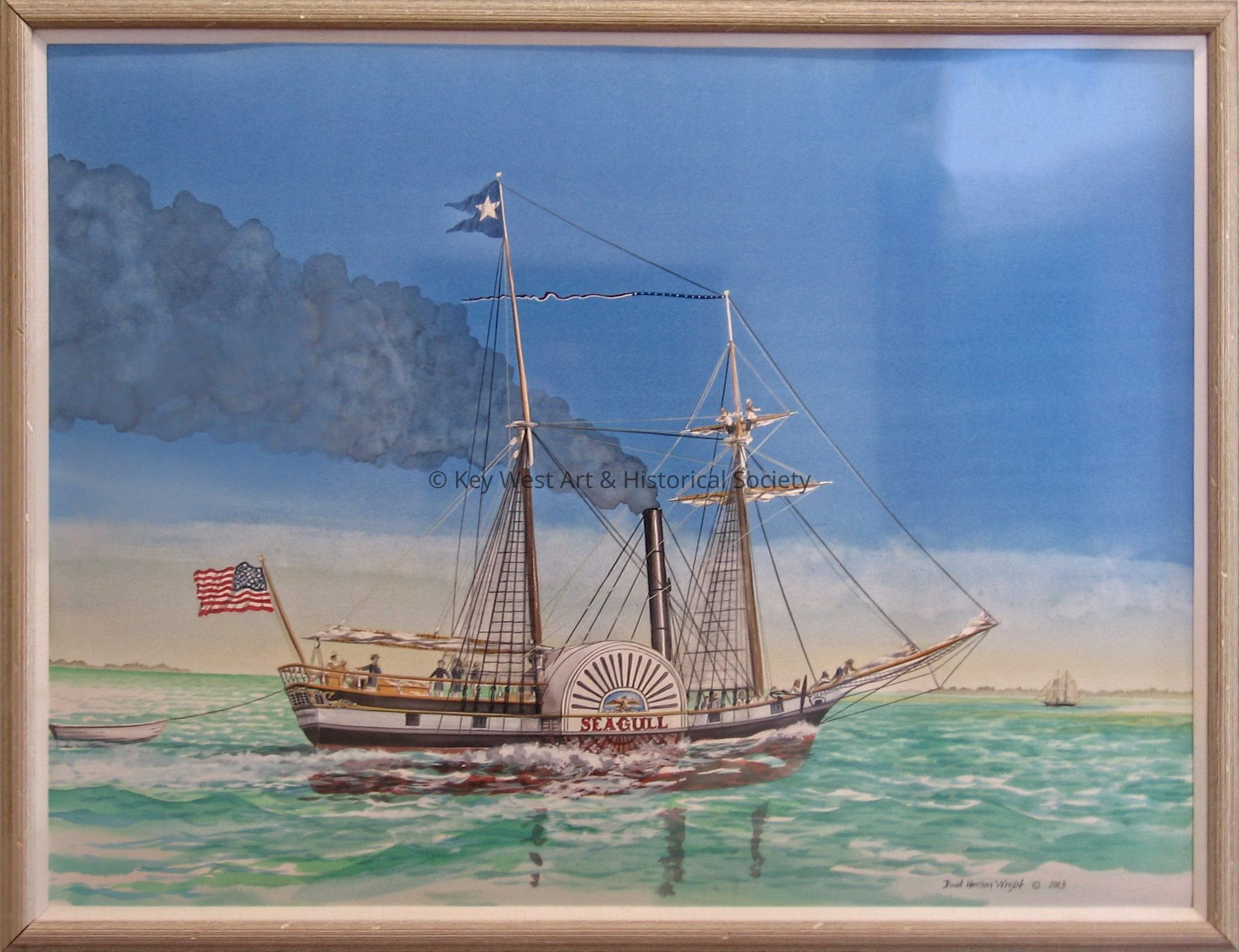 Watercolor on paper by David Harrison Wright depicting the USS SEAGULL off of Key West. The ship was one of the first steamships in the US Navy and was stationed in Key West with Commodore David Porter.