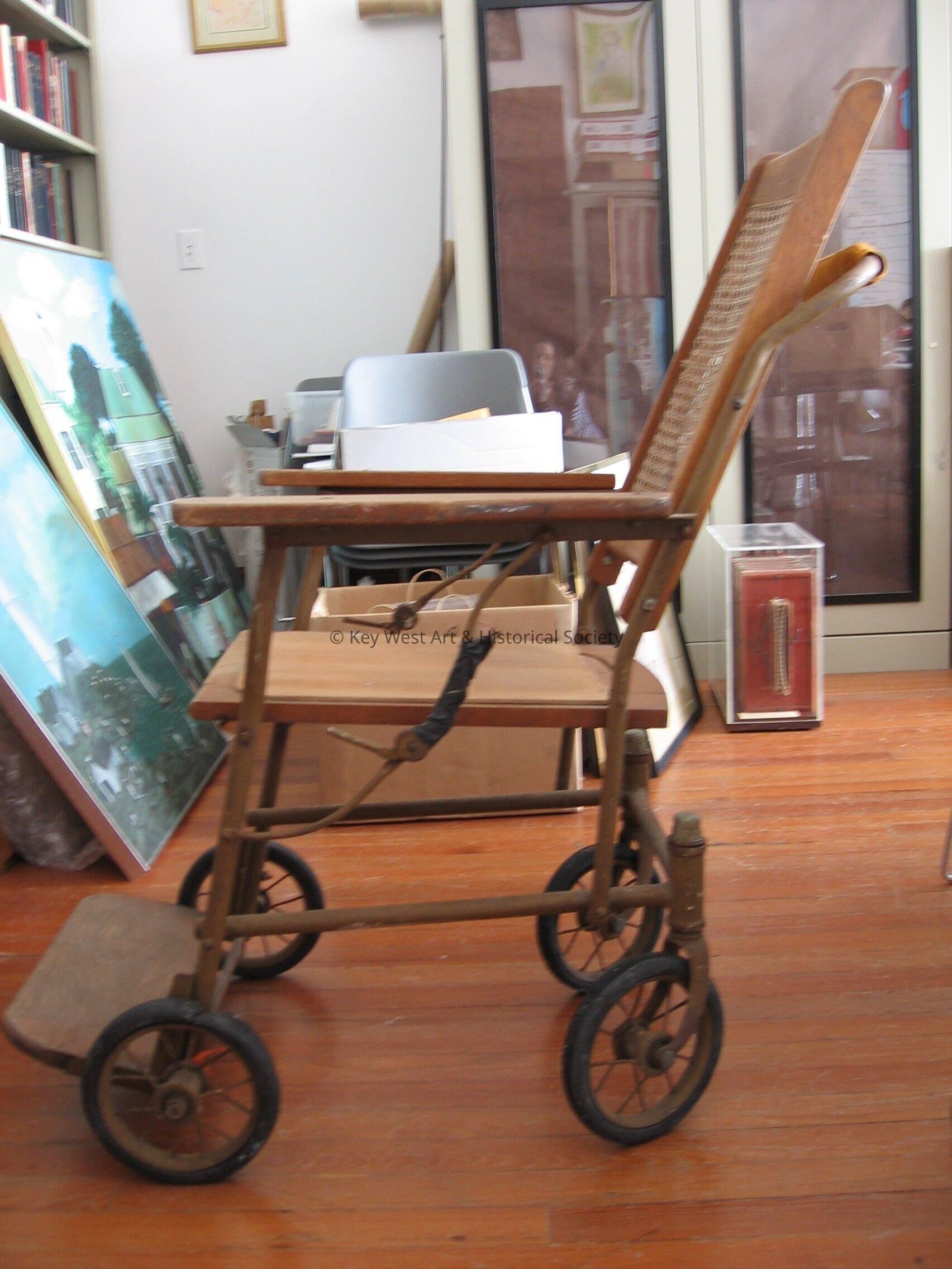 Old wheelchair with metal carriage, wood seat and back with cane insertsCollection