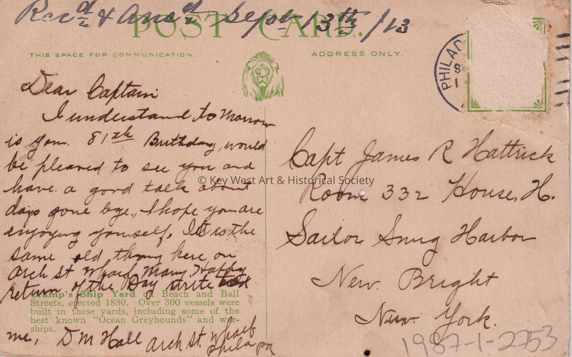Postcard depicting a steamship and men in small boats in a harbor.  The caption reads, ‘Cramp’s Shipyard, Philadelphia, Pennsylvania.’  The description on the verso reads, ‘Cramp’s Ship Yard, Beach and Ball Streets, erected 1830.  Over 300 vessels were built in these yards, including some of the best known “Ocean Greyhounds” and warships.’  The message on the verso reads, ‘Dear Captain, I understand tomorrow is your 81st birthday, would be pleased to see you and have a good talk about days gone by.  I hope you are enjoying yourself.  It is the same old thing here on Arch Street Wharf.  Many Happy returns of the Day.  Write to me. D. M. Hall, Arch Street Wharf, Philadelphia, Pennsylvania.’  Note on the verso reads, ‘Received and answered September 13, 1913.’  The card is addressed to Captain James R. Hattrick, Room 332, House H. Sailors Snug Harbor, New Bright, New York, and is postmarked Philadelphia.Collection