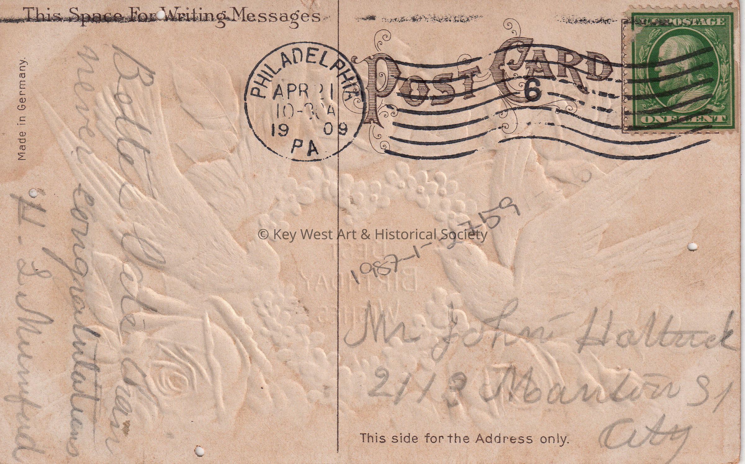 Postcard depicting roses and doves near a heart of flowers. The caption reads, ‘Best Birthday Wishes’. The message on the verso reads, ‘Better late than never. Congratulations, H. S. Mumford.’ The card is addressed to Mr. John Hattrick, 2113 Manton Street, City, and is postmarked Philadelphia, April 21, 1909.Collection