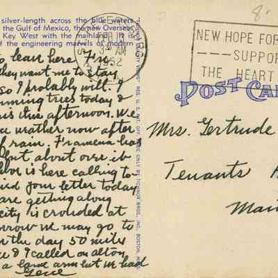 Postcard of off to sea with no seasickness over the new Overseas Highway on the way to Key West, Florida. Stretching its silver-length across the blue waters of the Atlantic and the Gulf of Mexico, the new Overseas Highway connects Key West with the mainland. It is regarded as one of the engineering marvels of modern times.Collection