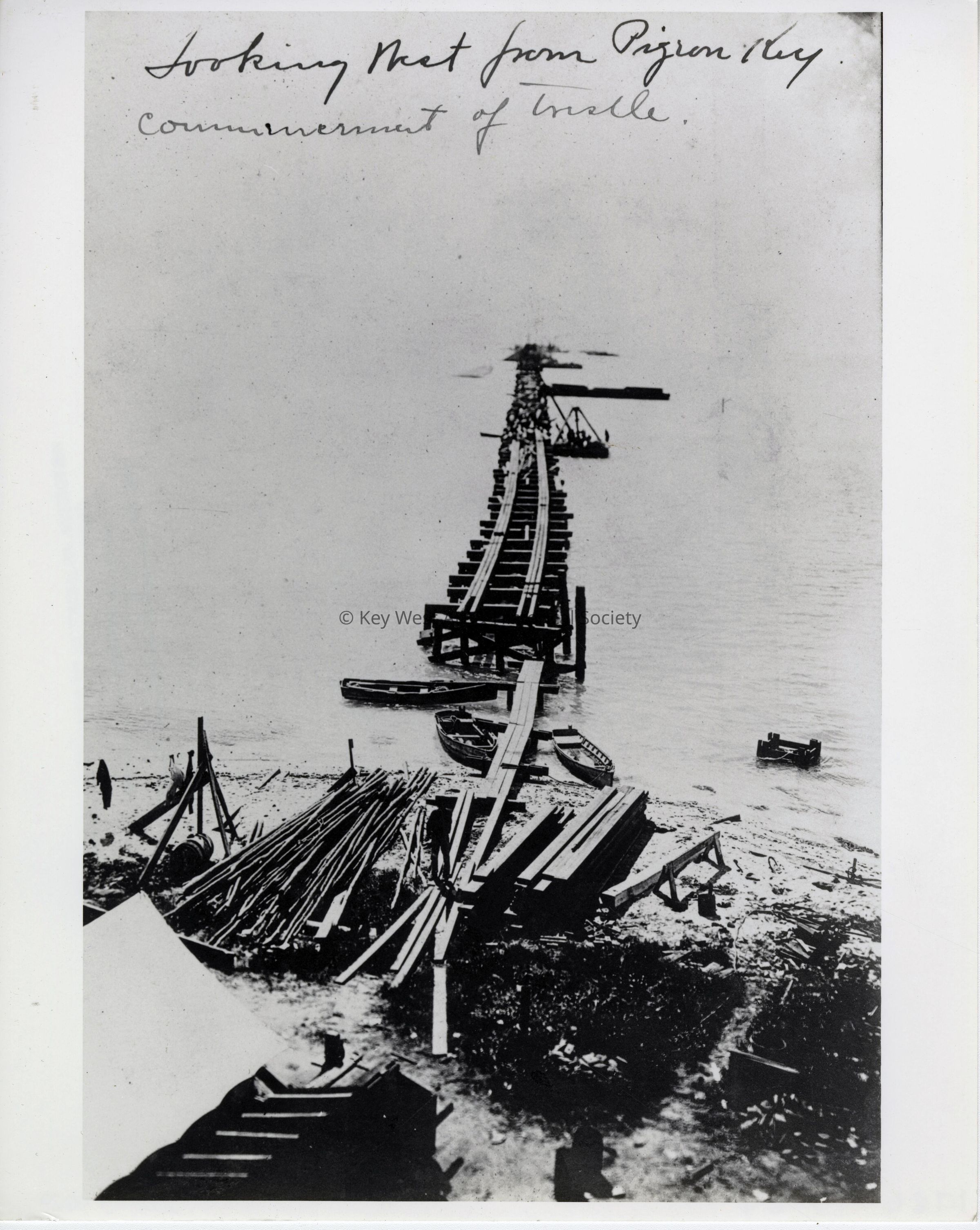 Black and white photograph taken from Pigeon Key, looking west, when the Florida East Coast Railway began construction on the trestle section of the Seven Mile Bridge.
