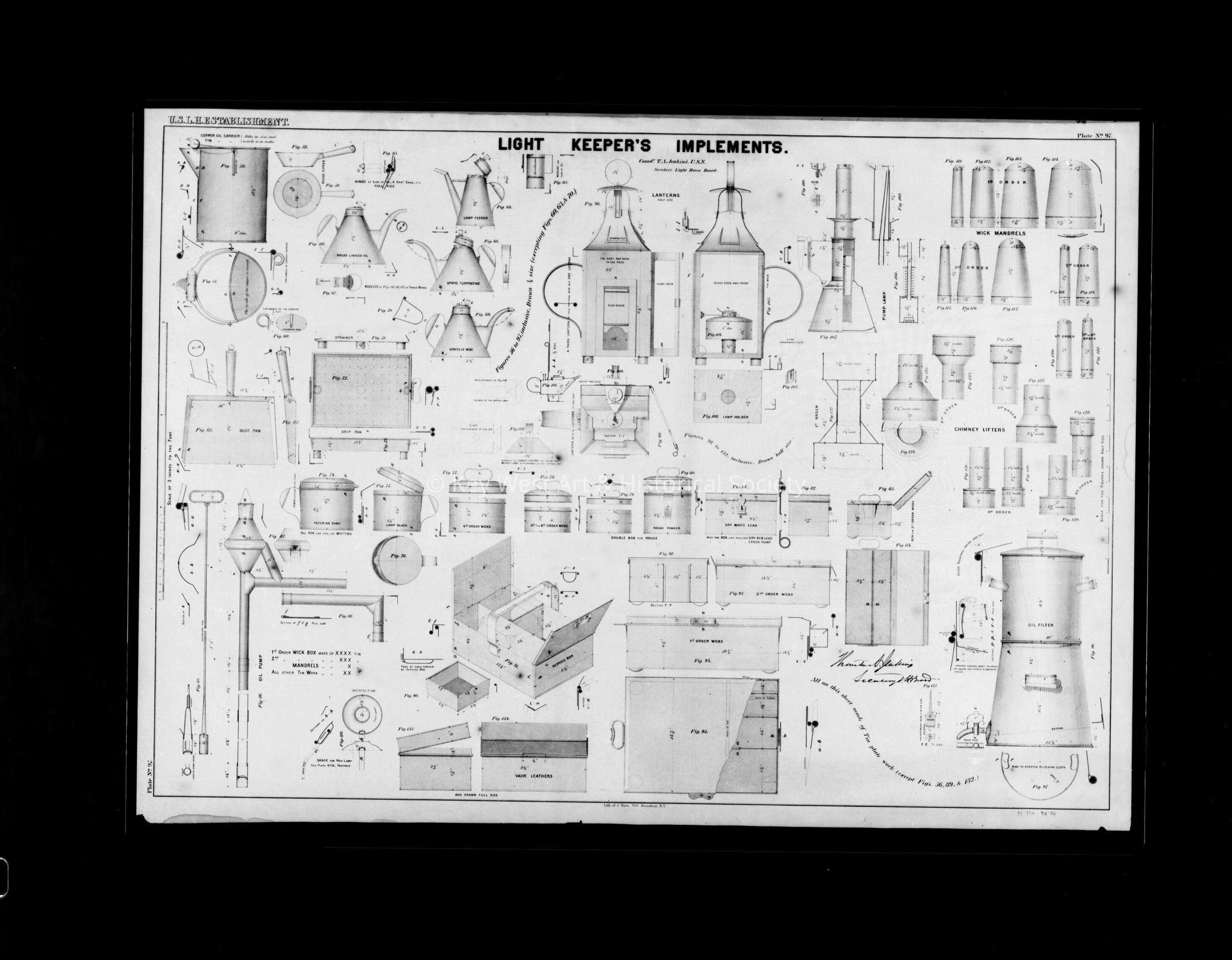 Black and white negative showing several tools used by Lighthouse Keepers employed by the U.S. Lighthouse Establishement.
