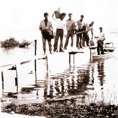 Black and white negative of Key West rum-runners at the end of long dock unloading a skiff.