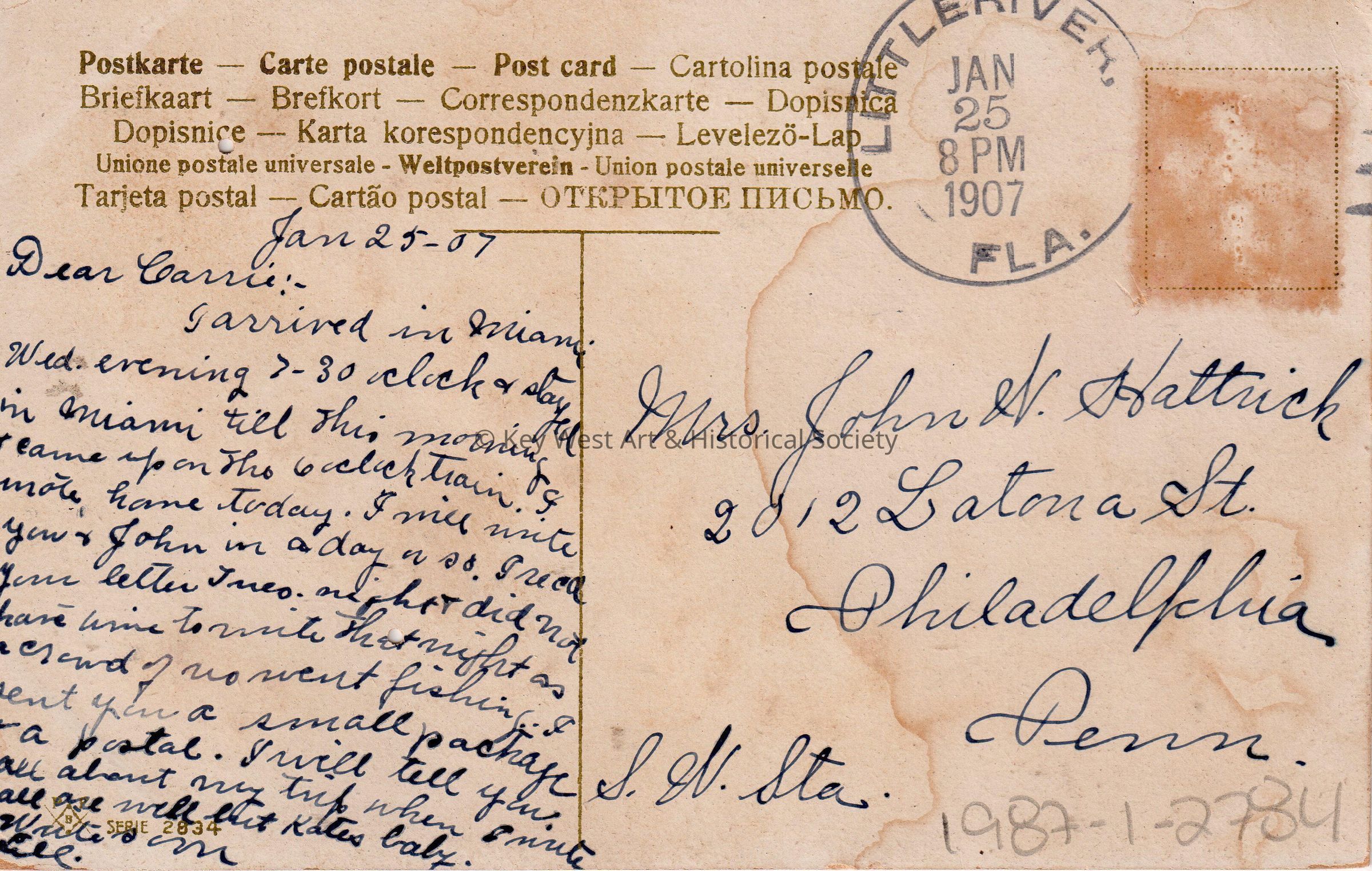 Postcard depicting flowers. The caption reads, ‘Greetings from Little River, Florida.’ The message on the verso reads, ‘January 25, 1907, Dear Carrie: I arrived in Miami Wednesday evening at 7:30 o’clock & stayed in Miami till this morning & came up on the 6 o’clock train. I wrote home today. I will write you & John in a day or so. I received your letter Tuesday night, did not have time to write that night as a crowd of us went fishing. I sent you a small package & a postal. I will tell you all about my trip when I write. All are well but Kate’s baby. Write soon, Lill.’ The card is addressed to Mrs. John W. Hattrick, 2012 Latona Street, Philadelphia, Pennsylvania, Southwest Station, and is postmarked Little River, Florida, January 25, 1907.Collection