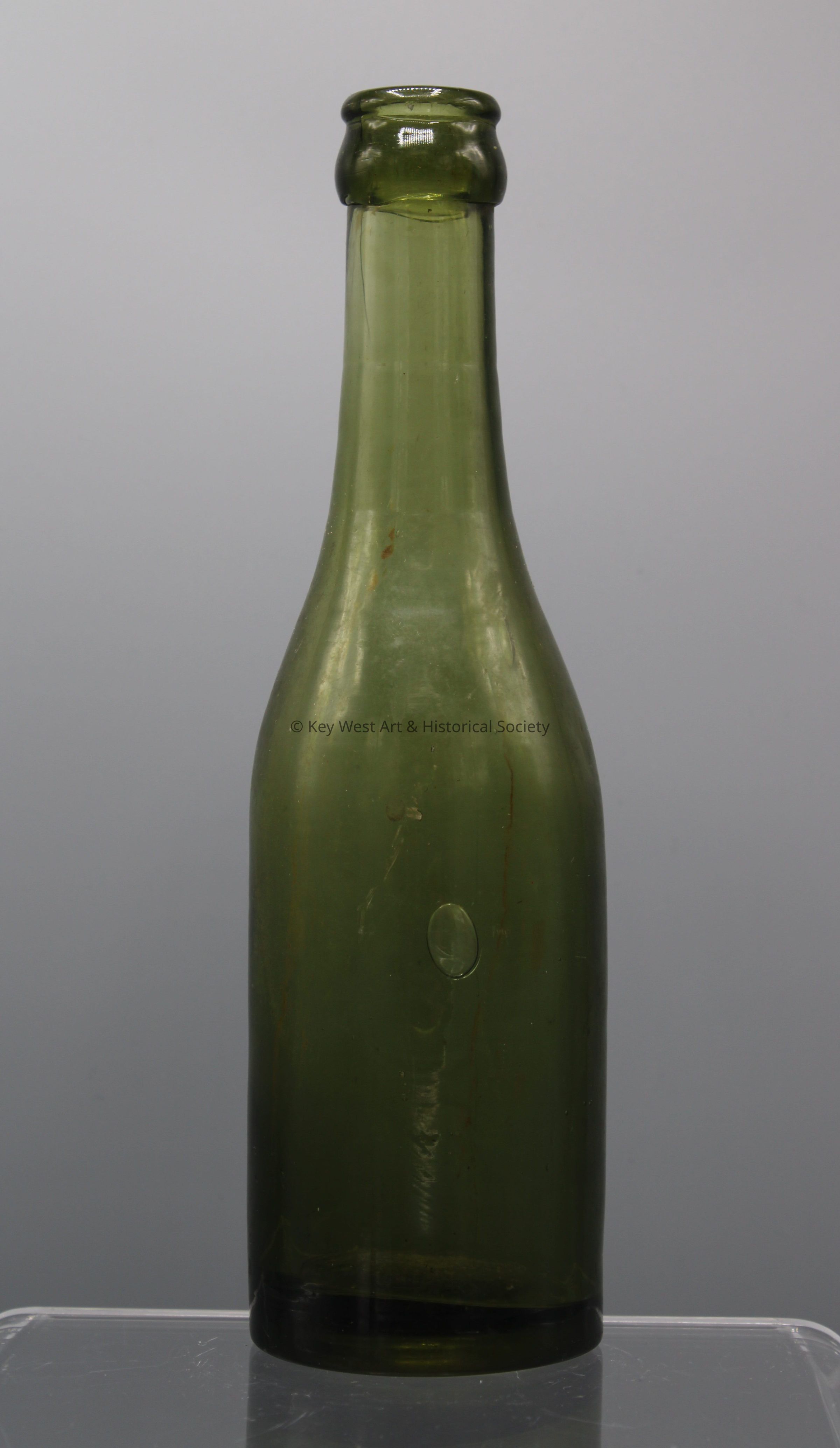 Green glass bottle with a long tapered neck. There are several large bubbles present in the glass.