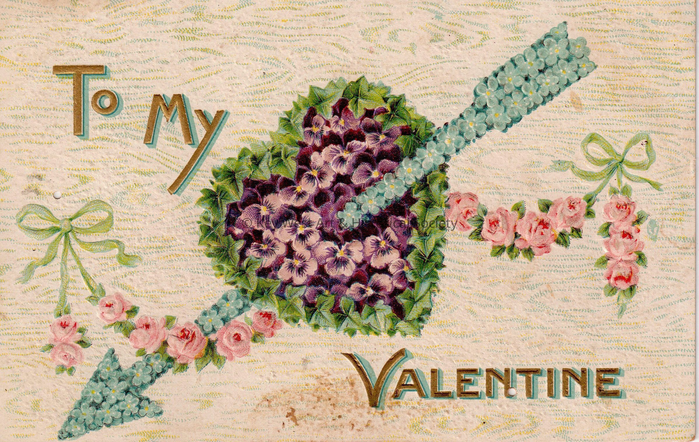 Postcard depicting a heart pierced with an arrow entirely made of flowers. The caption reads, ‘To My Valentine’.Collection