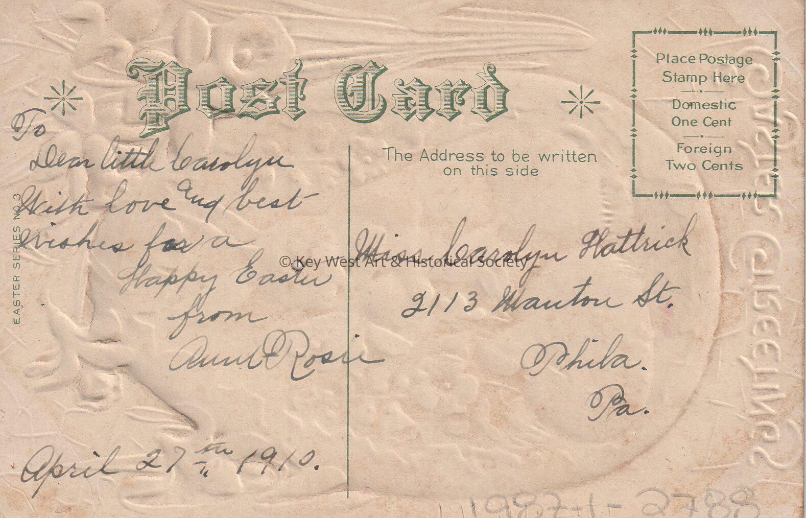 Postcard depicting daffodils surrounding an egg that contains a rabbit, carrot, chick, and another egg. The caption reads, ‘Easter Greetings’. The message on the verso reads, ‘To Dear little Carolyn with love and best wishes for a Happy Easter from Aunt Rosie.' The card is addressed to Miss Carolyn Hattrick, 2113 Manton Street, Philadelphia, Pennsylvania.Collection