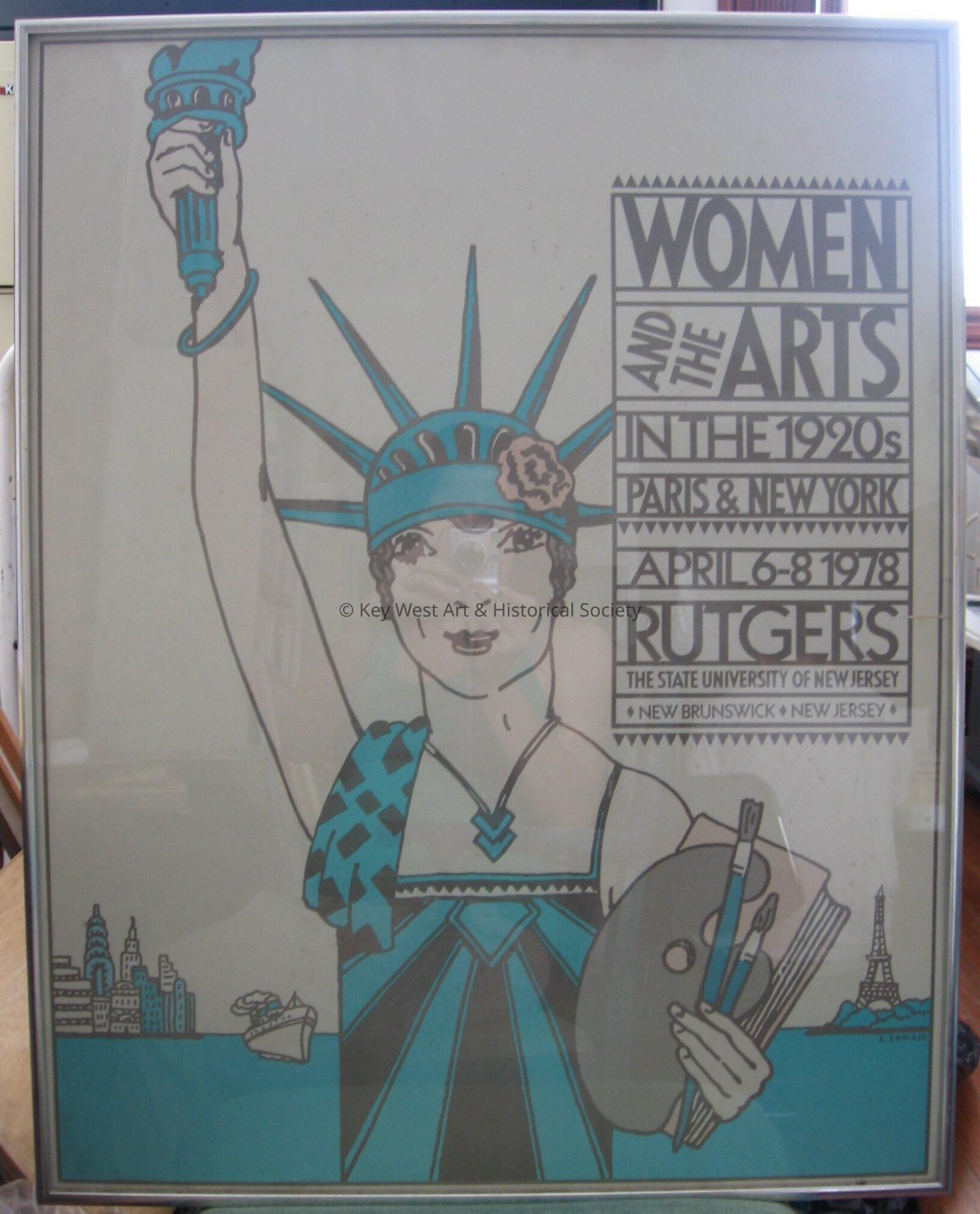 Color poster. Poster reads "Women and the Arts in the 1920's Paris & New York April; 6-8 1978 Rutgers the Stave University of New Jersey New Brunswick New Jersey. Image of the Statue of Liberty holding the torch in one hand and art supplies in the other. Framed.