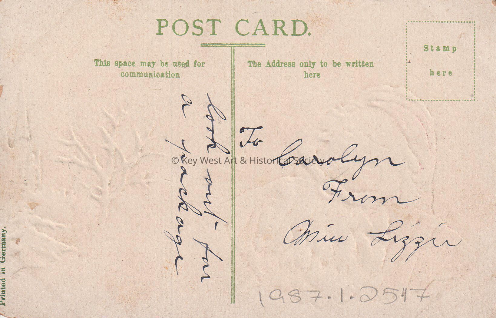 Postcard depicting Santa Claus near a moonlit church.  The caption reads, ‘A Merry Christmas’.  The message on the verso reads, 'Look out for a package, to Carolyn from Miss Lizzie'.Collection