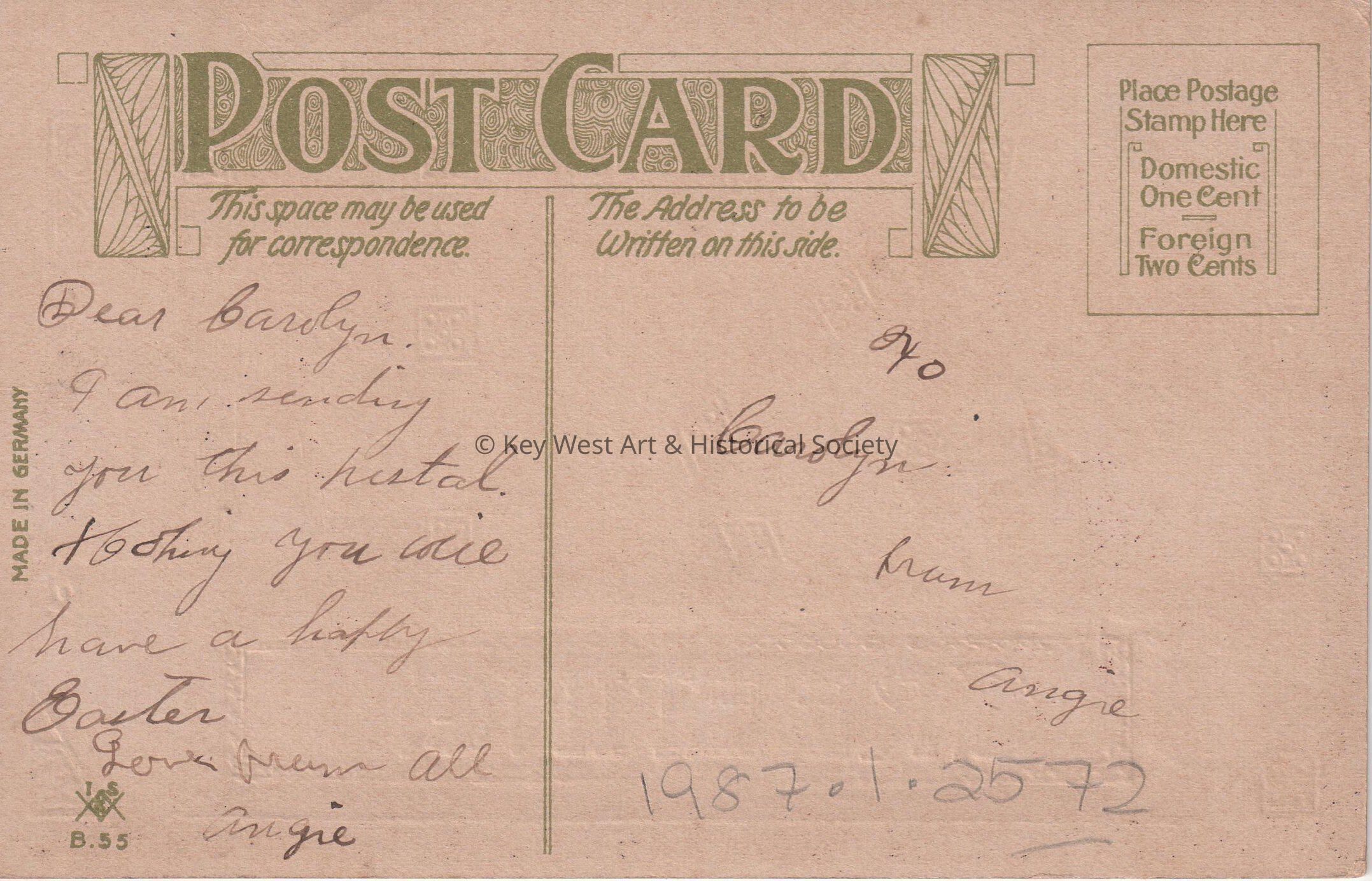 Postcard depicting rabbits in a crate. The caption reads, ‘Easter Greetings from Angie’. The message on the verso reads, ‘Dear Carolyn, I am sending you this postal hoping you will have a happy Easter. Love from All, Angie.’ The card is addressed to Carolyn from Angie.Collection